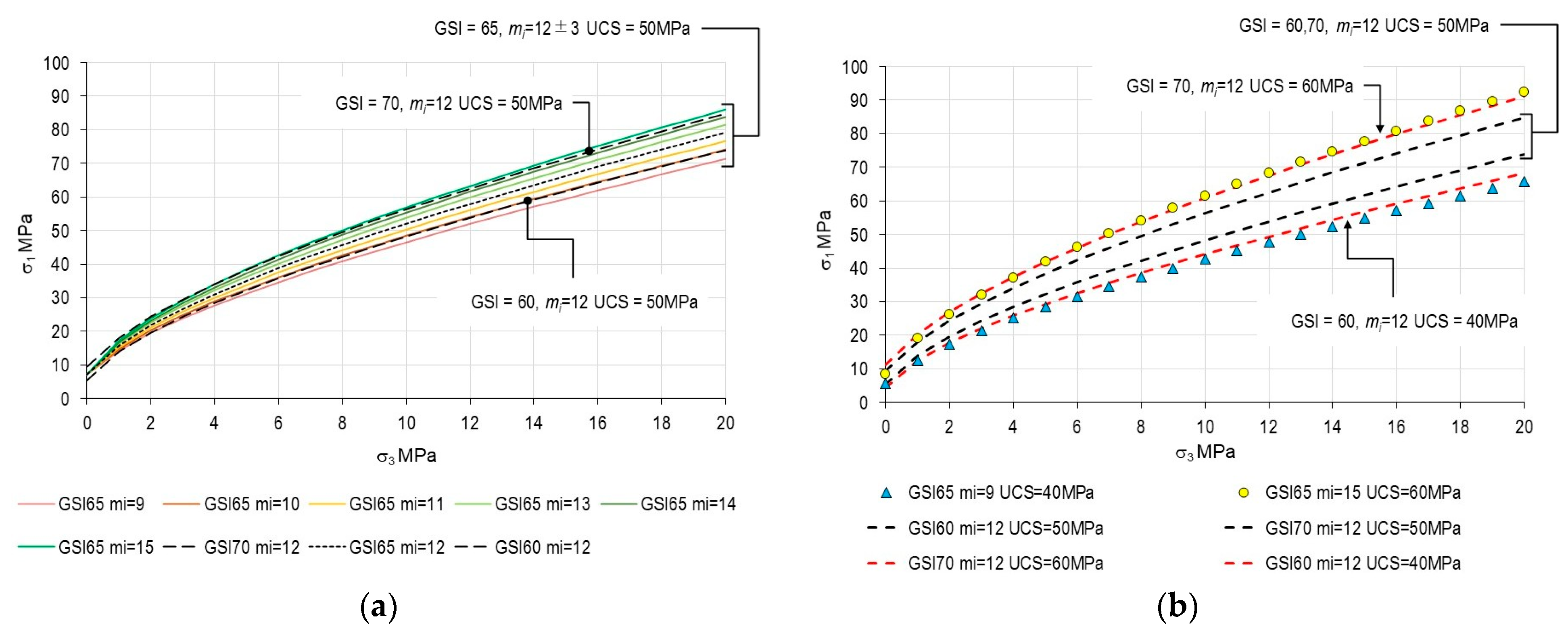 12. Marinos, V.; Carter, T. Integrating GSI and mi for Reliable Rockmass Strength Estimation: Integrating GSI and mi. Rock Mech. Rock Eng. 2025, 58, 11217–11260. [Google Scholar] [CrossRef]