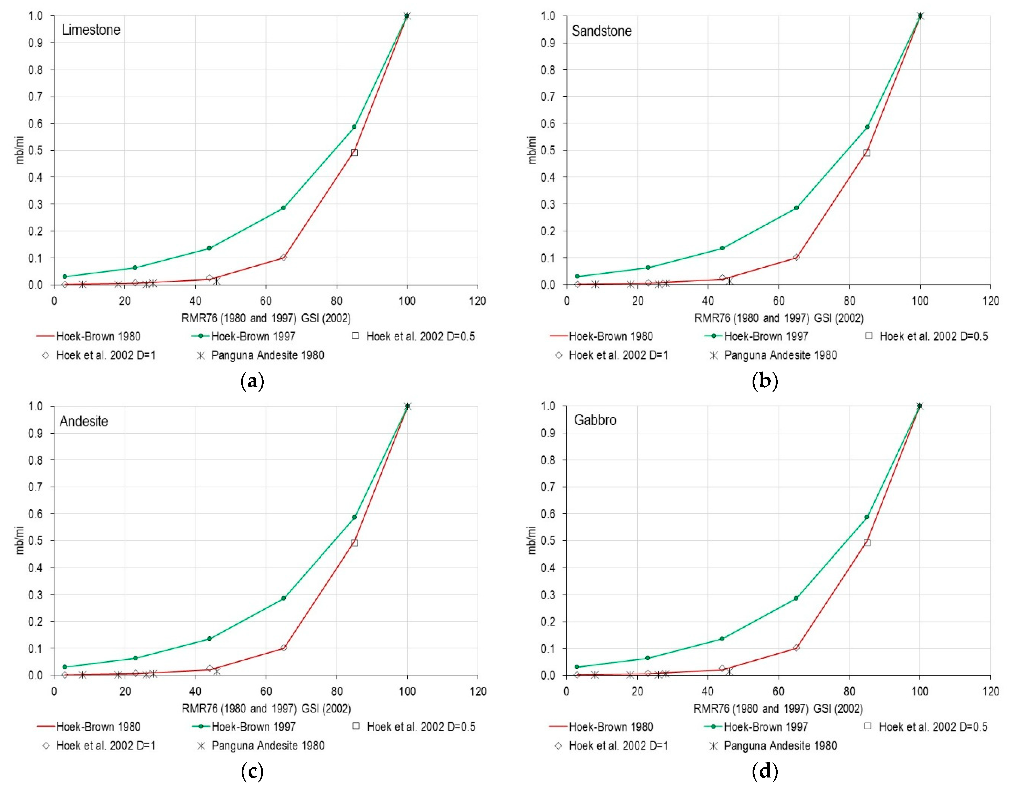 Figure 6. mb/mi relationships with rock mass quality for different rock types: (a) Limestone, (b) Sandstone, (c) Andesite and (d) Gabbro(based on data published originally in [9]). It becomes apparent that the same exponential relationship is invoked for all rock types, despite a lack of field validation, implying that different rock masses may experience proportionally identical strength reductions relative to their input mi and GSI values. Modified from [21].