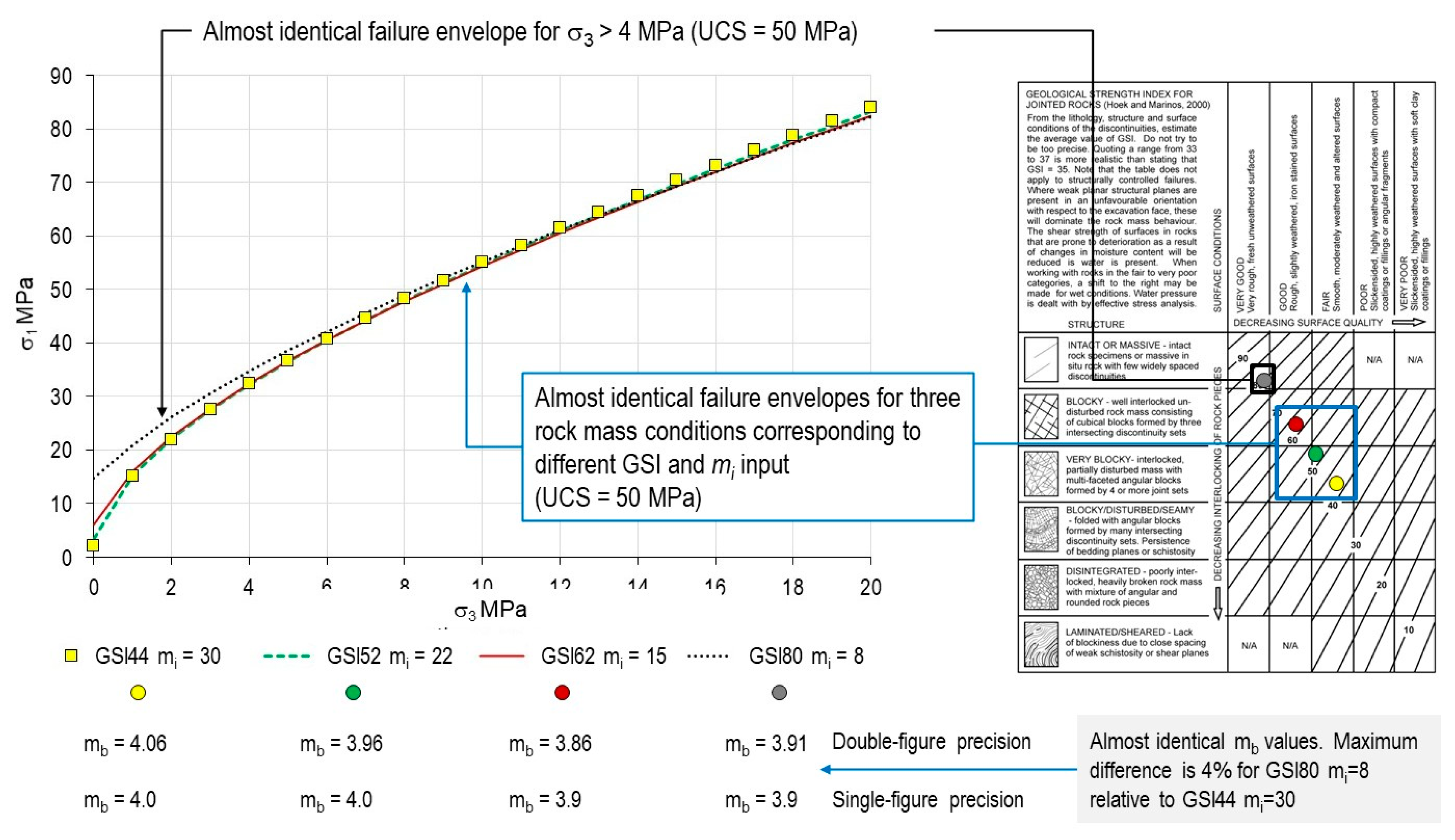 Figure 7. Example of rock mass conditions yielding almost identical Hoek–Brown curves despite representing dramatically different geological conditions. The Figure shows how empirical parameters derived from geological complexity cannot always be reverse-engineered to reveal the original geological understanding.