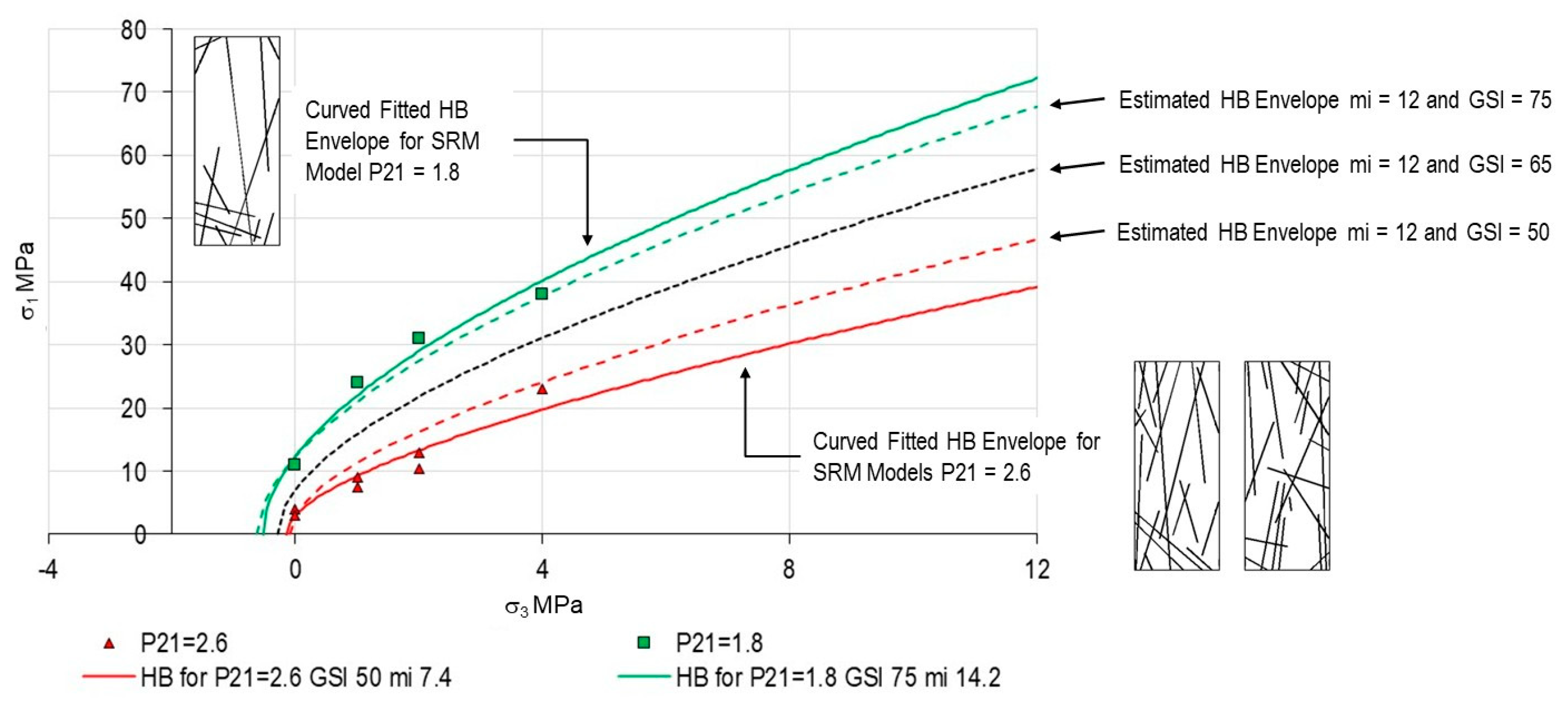 If mi relates to fracture mechanics and crack initiation processes [14], one would expect it to vary with fracture connectivity, which governs stress localization through block interlocking mechanisms. Using data from [14], Figure 8 shows that when fitting Hoek–Brown curves to simulated biaxial test data (synthetic rock mass, SRM, models), the derived mi parameter varies with fracture intensity. While reasonable curve-fitting can be achieved by constraining mi to the intact rock value (mi = 12) and adjusting only GSI, this approach yields systematically different GSI estimates compared to allowing both parameters to vary (GSI range of [38, 79] vs. [50, 75], respectively, with reference to Figure 8).