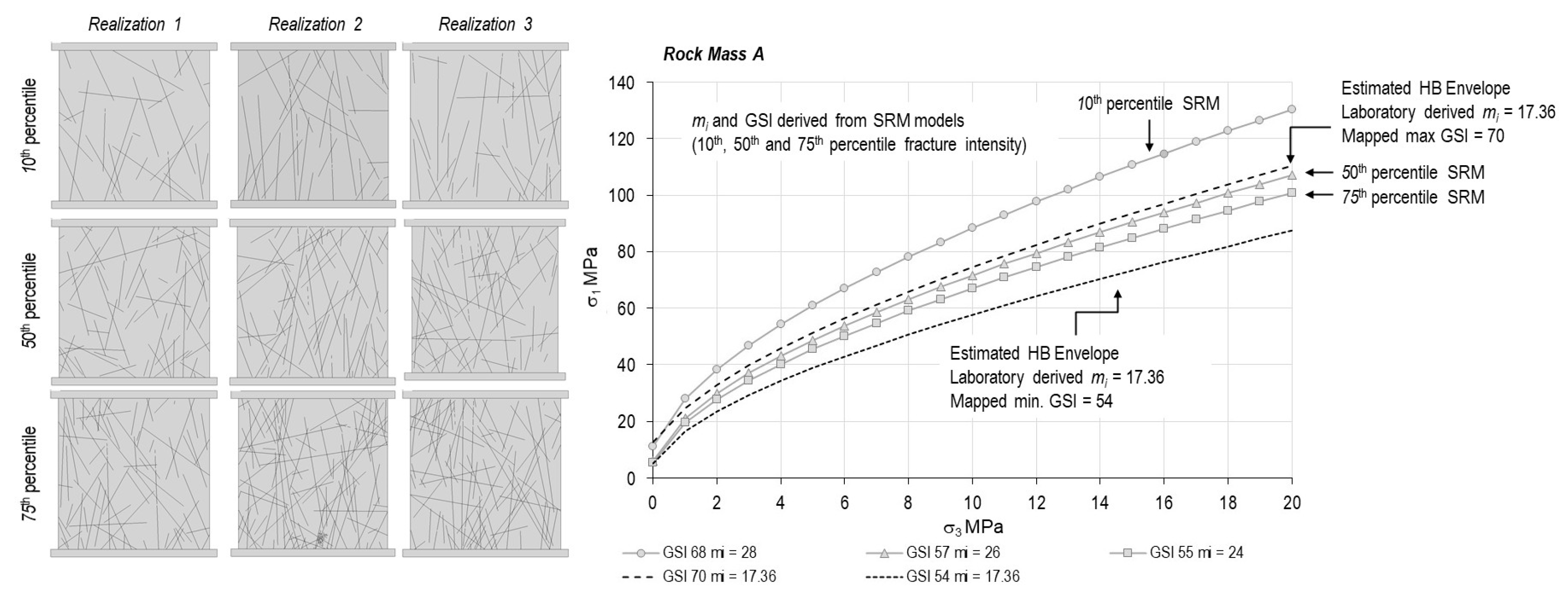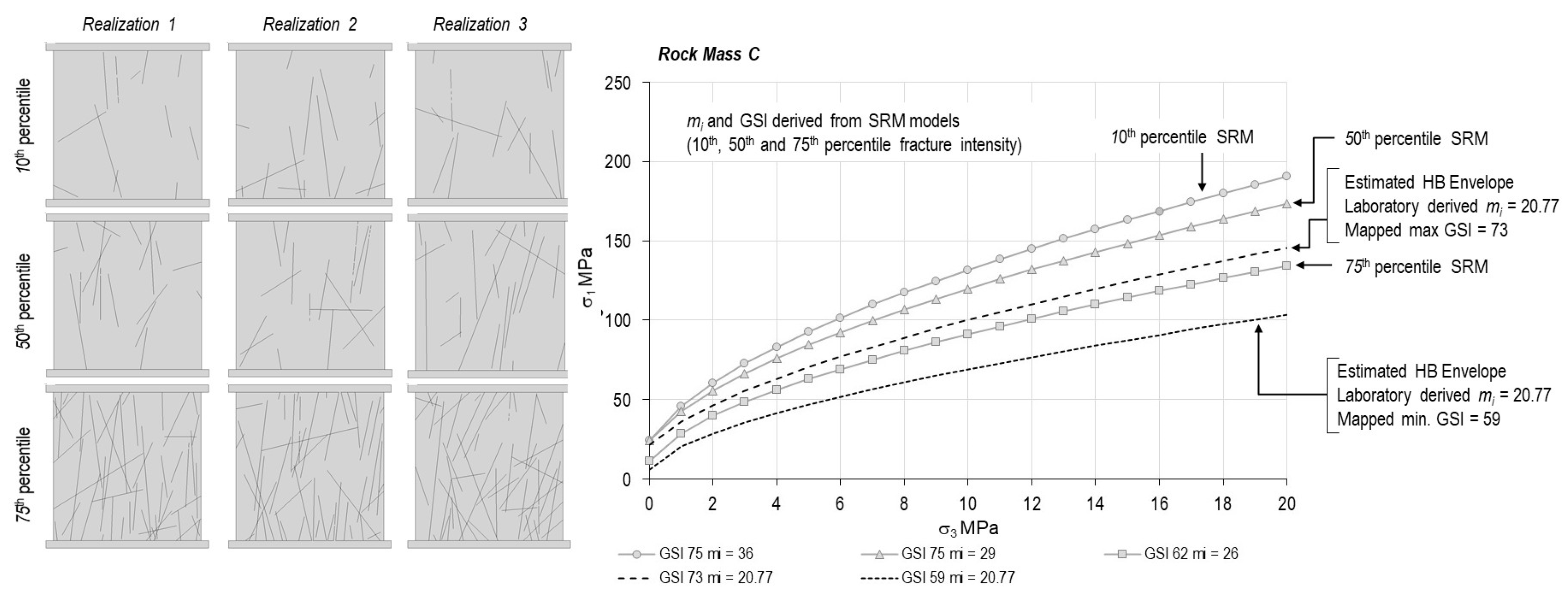 While SRM studies are often used to demonstrate apparent size effects (as modelled volumes decrease, calculated rock mass strength increases), this interpretation may confuse mechanisms with dimensions [23]. Indeed, Bewick and Elmo [23] demonstrated behaviour contrary to conventional size effect theory, in which rock mass strength either remains scale-invariant (models without DFNs) or actually decreases with decreasing size (models with homothetical DFNs).