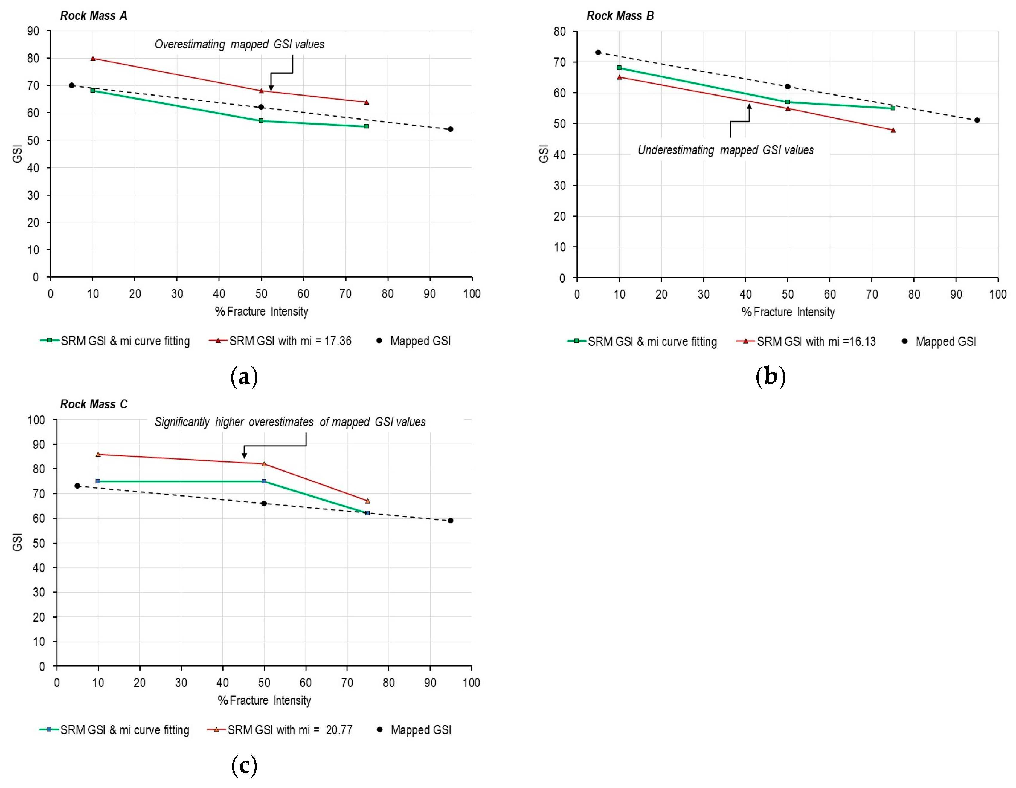 Figure 12. Comparison between field-based GSI (dashed line) and SRM-derived GSI estimates using the two fitting approaches introduced in the text: (i) GSI fitted with mi constrained to laboratory values (red line), and (ii) GSI and mi fitted simultaneously (green line). (a) Results for Rock Mass A in Figure 9; (b) results for Rock Mass B in Figure 10; and (c) results for Rock Mass A in Figure 11.