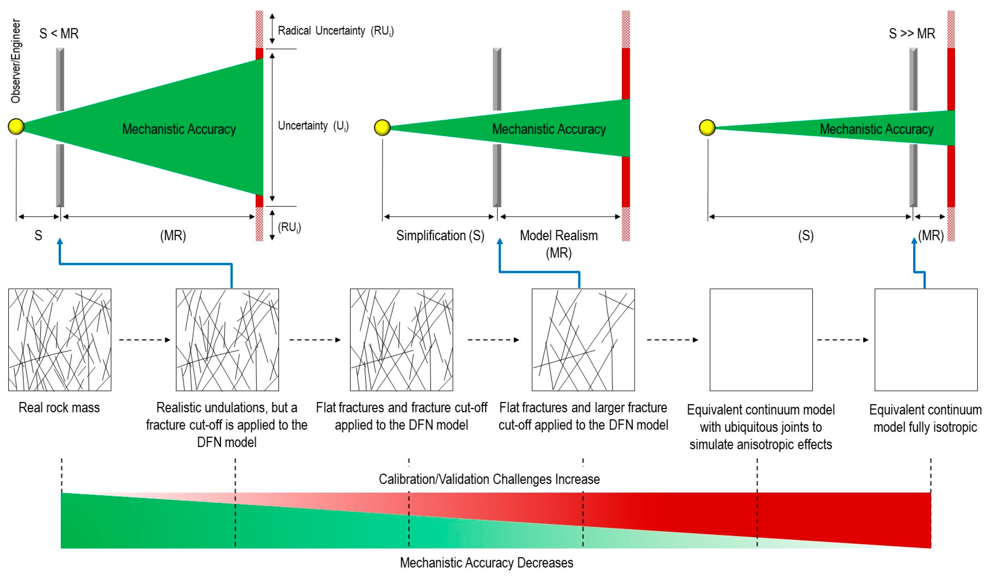 Figure 13. The validation paradox in rock mass modelling. As models progress from mechanistic realism (MR) to simplification (S), calibration/validation challenges increase while mechanistic accuracy decreases, and the impact of model uncertainty increases.
