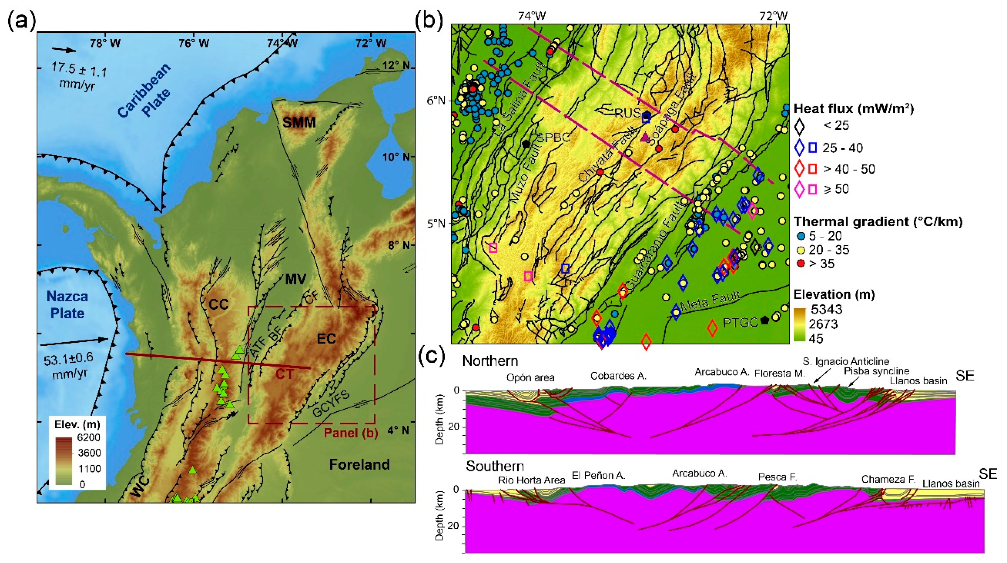 - Siravo, G.; Faccenna, C.; Gérault, M.; Becker, T.W.; Fellin, M.G.; Herman, F.; Molin, P. Slab Flattening and the Rise of the Eastern Cordillera, Colombia. Earth Planet. Sci. Lett. 2019, 512, 100–110. [Google Scholar] [CrossRef]