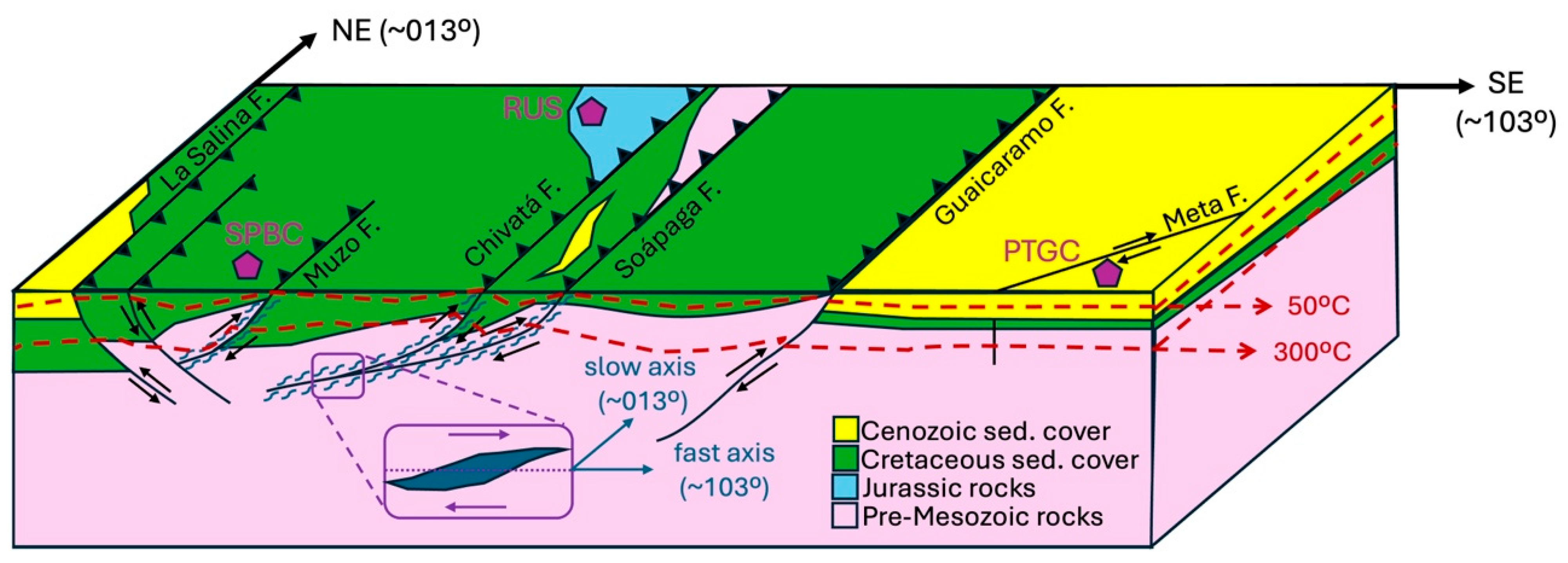 - Tesón, E.; Mora, A.; Silva, A.; Namson, J.; Teixell, A.; Castellanos, J.; Casallas, W.; Julivert, M.; Taylor, M.; Ibáñez-Mejía, M.; et al. Relationship of Mesozoic Graben Development, Stress, Shortening Magnitude, and Structural Style in the Eastern Cordillera of the Colombian Andes. Geol. Soc. Spec. Publ. 2013, 377, 257–283. [Google Scholar] [CrossRef]