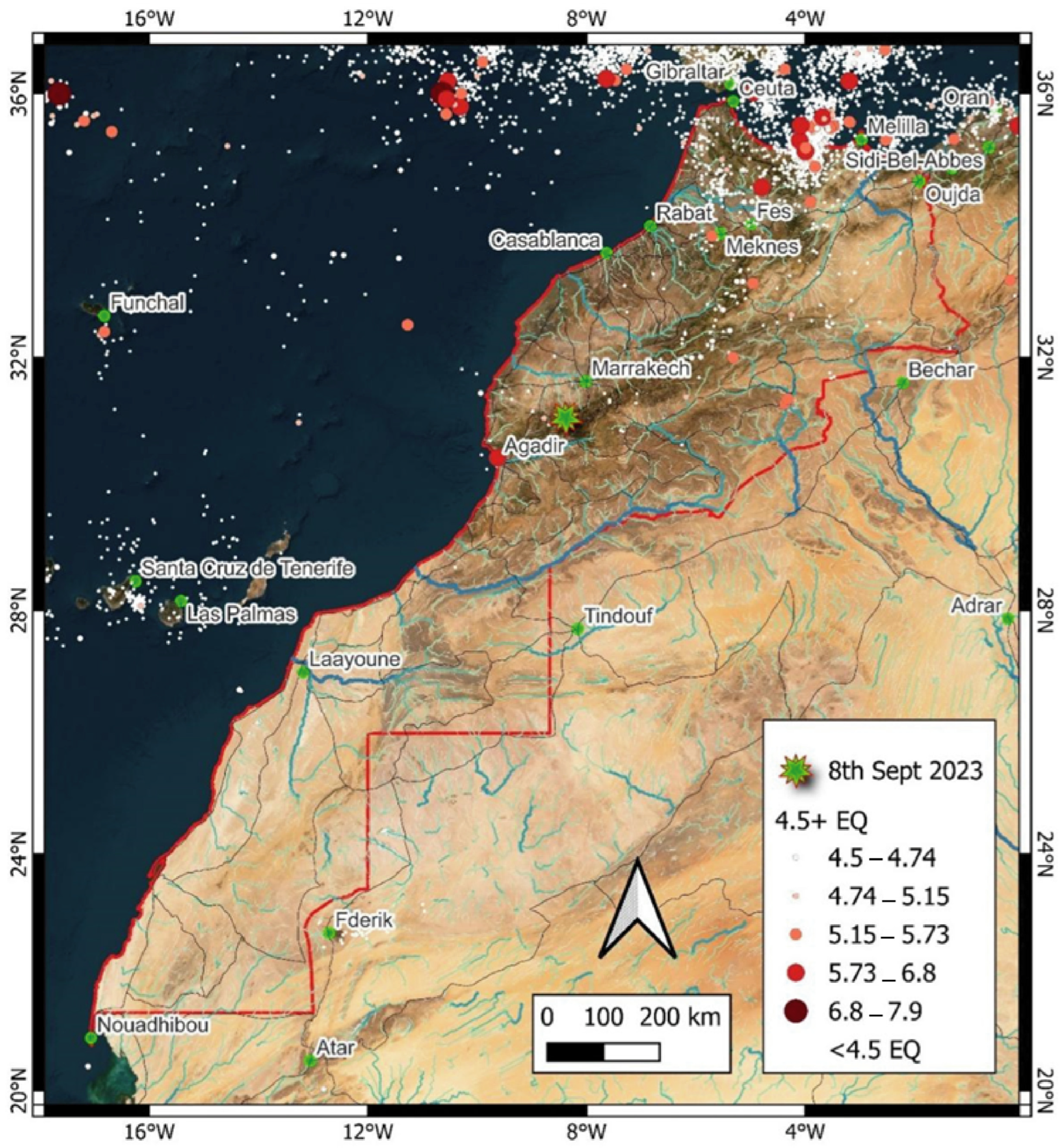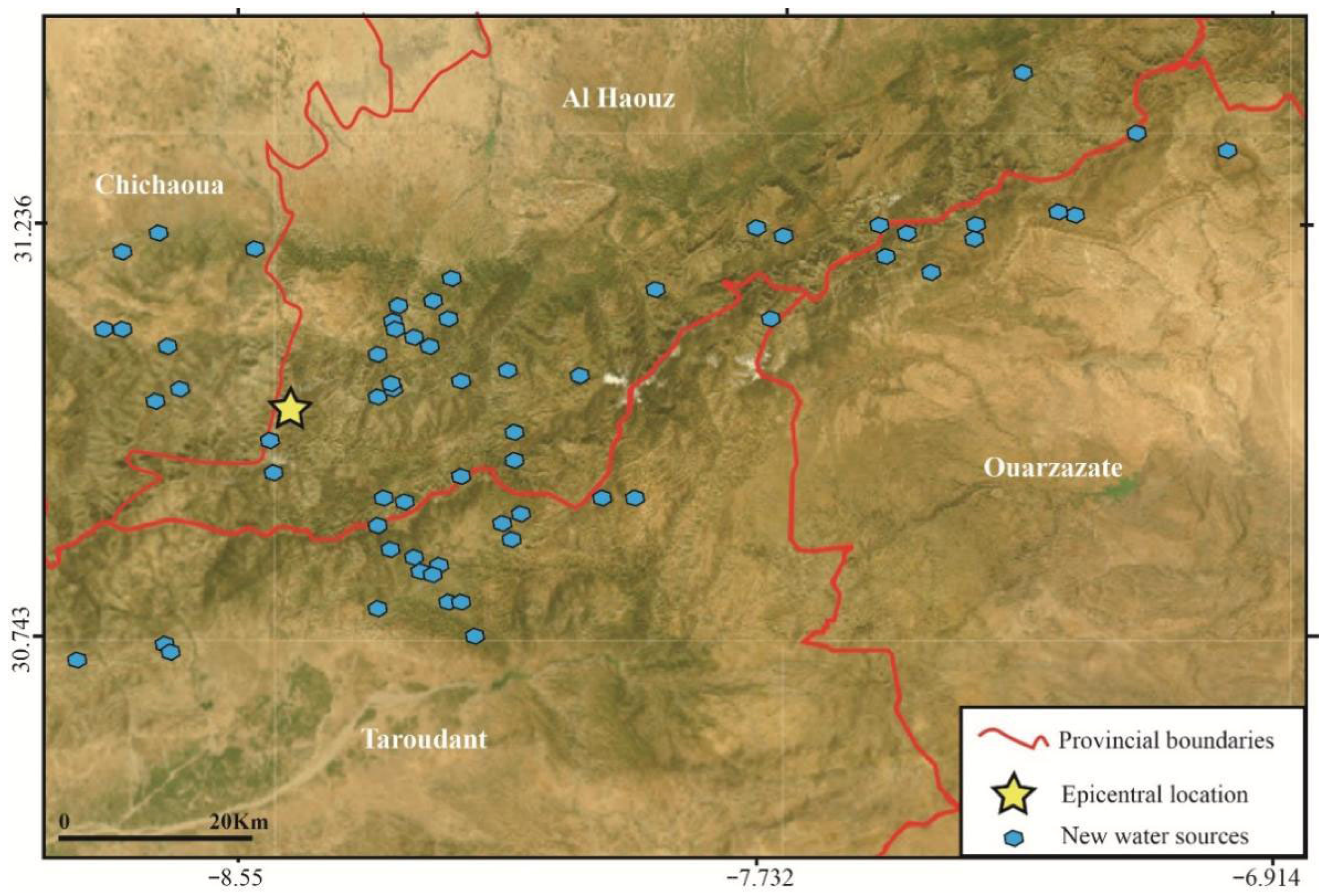 - News, S. SNRT News. (2024, January 9)—Nizar Baraka: De Nouvelles Sources d’Eau Sont Apparues Suite au Séisme d’Al Haouz. SNRT News. 2024. Available online: https://snrtnews.com/fr/article/nizar-baraka-de-nouvelles-sources-deau-sont-apparues-suite-au-seisme-dal-haouz-89976 (accessed on 7 February 2026).