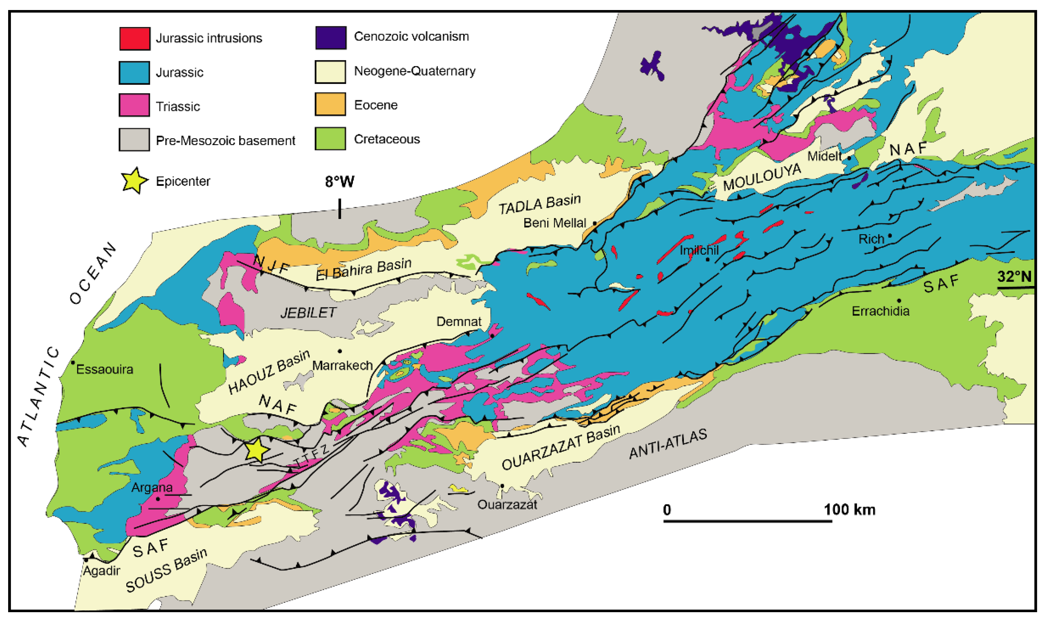 - Mustaphi, H.; Medina, F.; Jabour, H.; Hoepffner, C. Le bassin du Souss (Zone de Faille du Tizi n’Test, Haut Atlas occidental, Maroc): Résultat d’une inversion tectonique contrlée par une faille de détachement profonde. J. Afr. Earth Sci. 1997, 24, 153–168. [Google Scholar] [CrossRef]