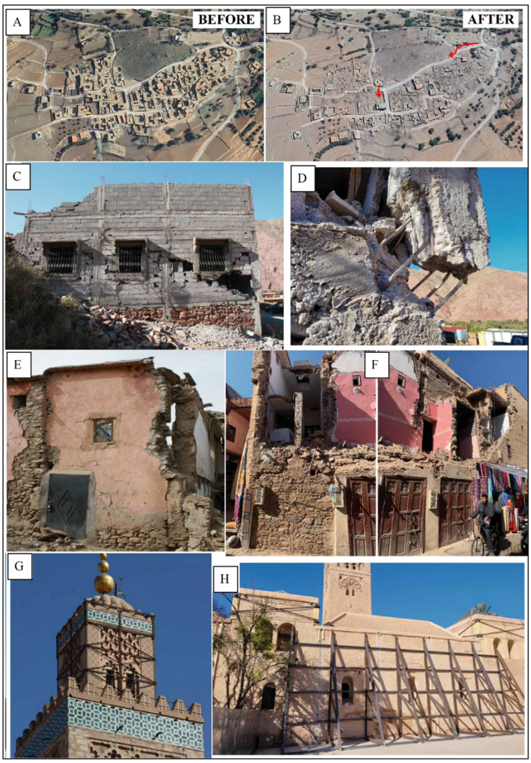 - Imtiaz, A.; Saloustros, S.; Beqiraj, M.; Cortés, G.; Devaux, M.; Lattion, E.; Zhu, Y.; Sehaqui, H. Understanding building damage through the lens of the Swiss post-seismic reconnaissance mission of 2023 Al Haouz, Morocco, earthquake. Sci. Rep. 2025, 15, 16587. [Google Scholar] [CrossRef] [PubMed]