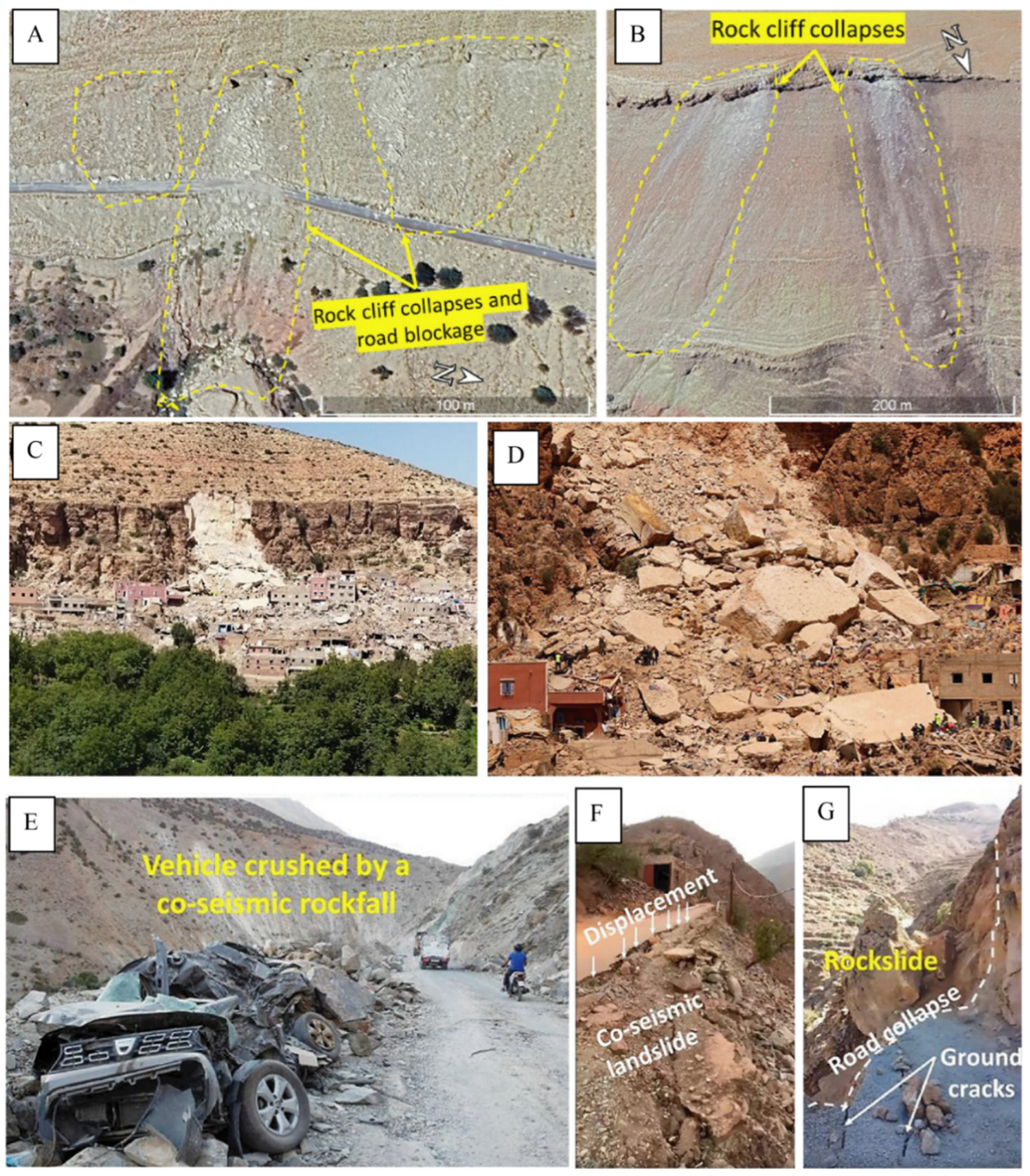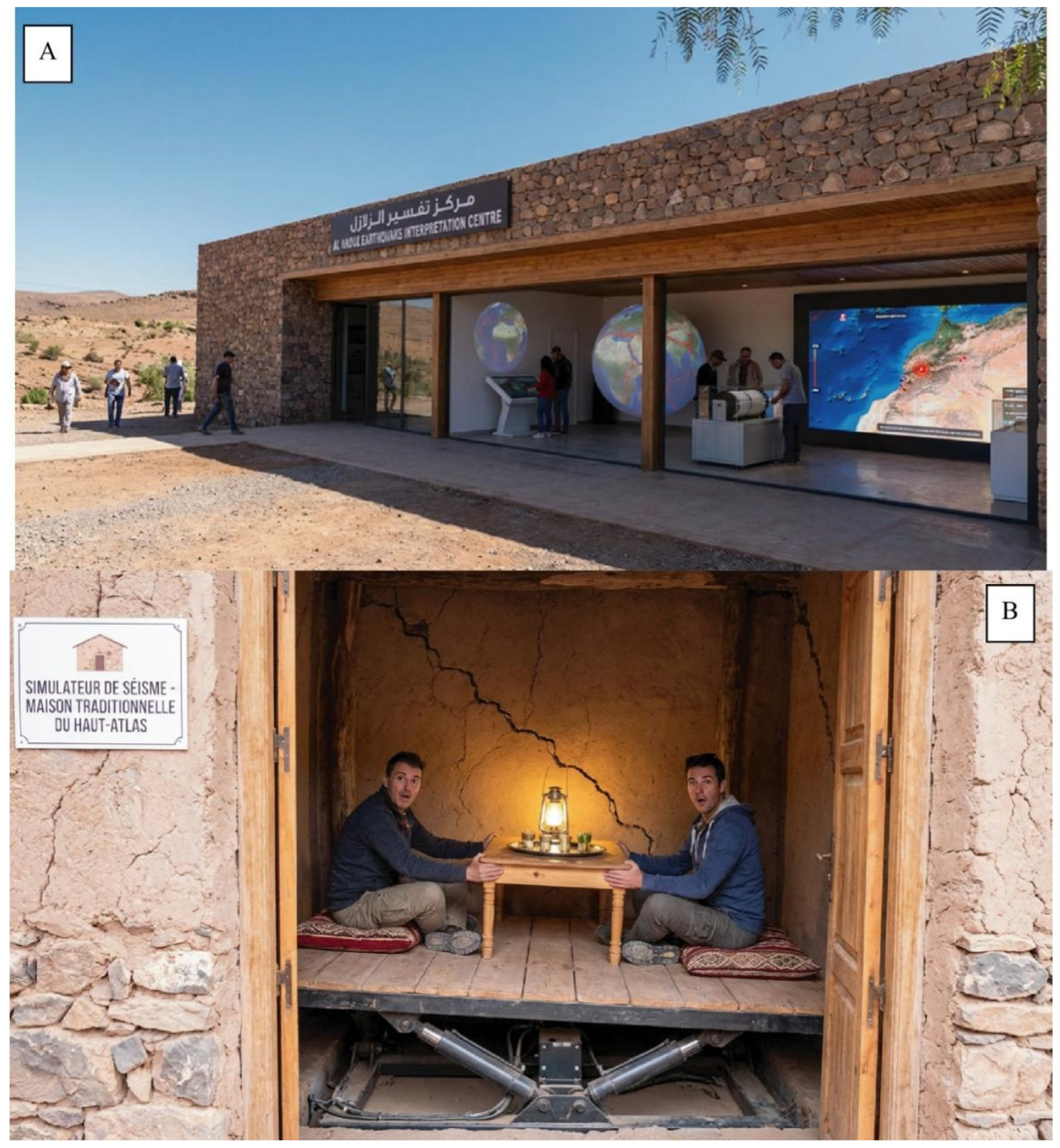 - Ottria, G.; Ellero, A.; Frassi, C.; Amorfini, A.; Rosani, I.; Benato Cortecci, M. Human reactions to the 2023 Al Haouz earthquake in Marrakech, Morocco: Findings from a survey within the UNESCO Global Geoparks community. Int. J. Disaster Risk Reduct. 2025, 125, 105597. [Google Scholar] [CrossRef]