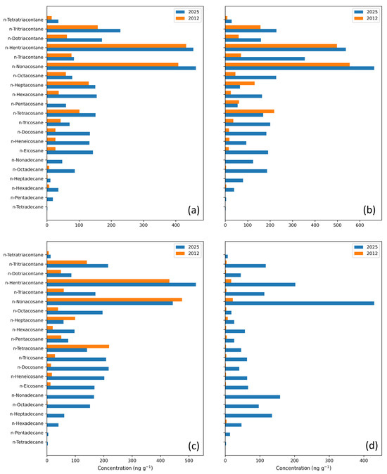 Although absolute n-alkane concentrations increased between 2012 and 2025, the compositional pattern remained largely unchanged. Statistically significant increases were observed mainly for short- to mid-chain n-alkanes (C14–C23), which are known to be more sensitive to environmental conditions such as hydrology, redox state, and early diagenesis. In lacustrine and floodplain systems, short-chain n-alkanes are often associated with algal and microbial production, whereas mid-chain compounds may reflect inputs from aquatic macrophytes [37,38].