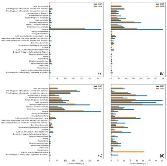 When the two sampling periods are compared as groups, statistically significant differences are restricted to a subset of compounds (Figure 6). Cadalene, fluoranthene, pyrene, chrysene, 3,3′,7,12a-tetramethyloctahydrochrysene, some trimethylphenanthrenes, and the high-molecular-weight PAHs benzo[b]fluoranthene and benzo[k]fluoranthene show higher mean concentrations in 2025 than in 2012, as indicated by distinct Tukey letters (a vs. b). In contrast, dihydro-trimethyl-phenyl-1H-indene presented higher levels in 2012.