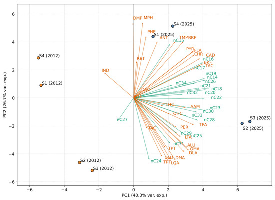 In order to explore multivariate patterns that were not evident from the univariate results, a principal component analysis (PCA) combining all n-alkanes and aromatic hydrocarbons was applied, and the results are shown in Figure 7. In the biplot, loading vectors represent individual compounds, with aliphatic compounds in green and aromatic compounds in orange. The first component (PC1, 40.3% of the variance) clearly separated the two sampling periods: all 2012 samples were plotted on the negative side of PC1, whereas all 2025 samples fell on the positive side. Most variables with the strongest contributions to PC1 showed loadings oriented toward the positive PC1 direction, indicating that the 2025 samples were associated with a broader co-variation (and, overall, higher multicomponent signal) across both aliphatic and aromatic fractions relative to 2012. Accordingly, PC1 was interpreted as a temporal gradient that captured the decadal shift between the two campaigns, rather than a site-specific effect.