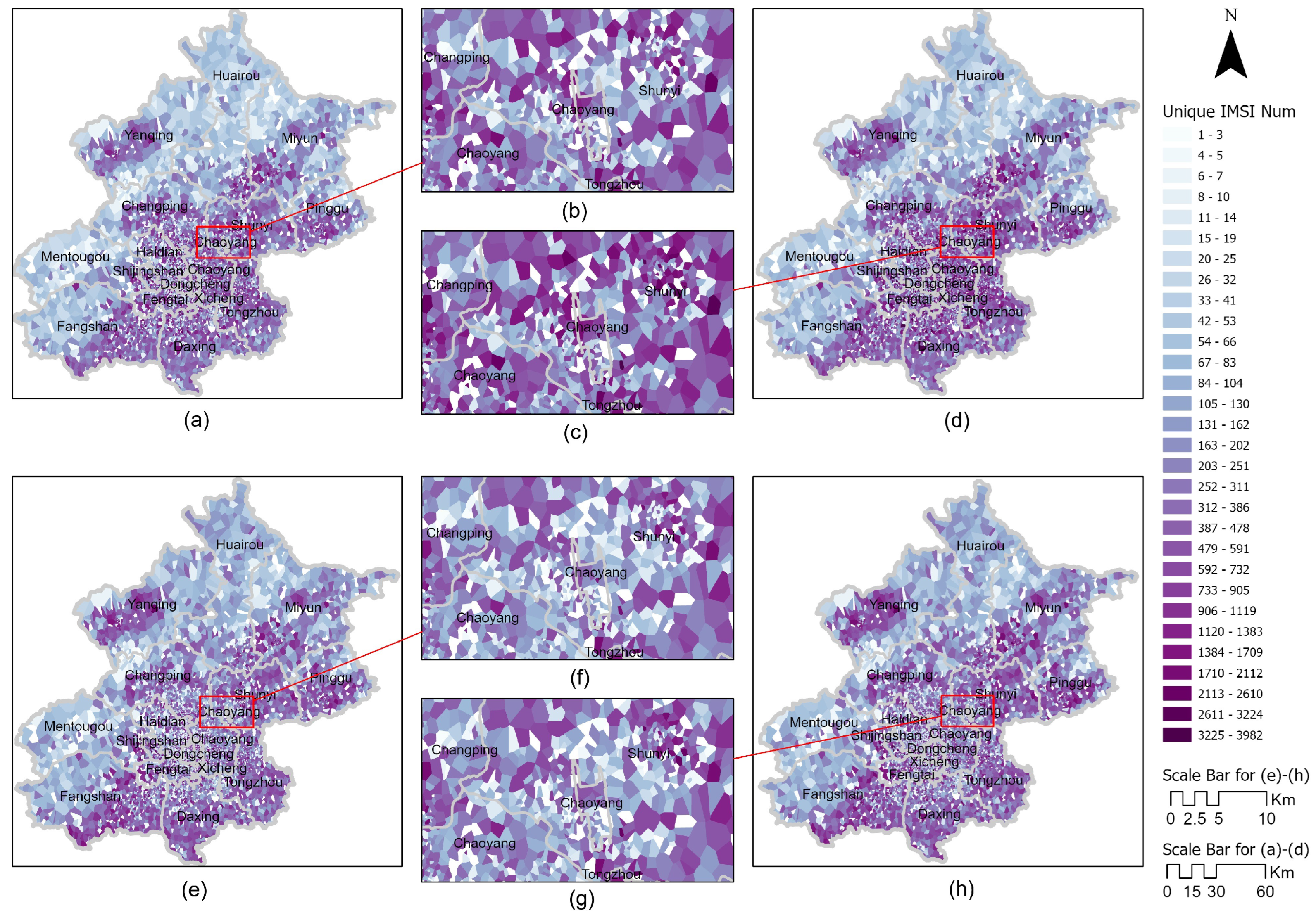 Four examples of the CDR-based population distribution (unique IMSI number) at different time points. (a) Description of population distributions across all of Beijing at 6:00 a.m. on 2 February 2015; (b) Description of population distributions across all of Beijing at 6:00 p.m. on 2 February 2015; (c) Description of population distributions across all of Beijing at 6:00 a.m. on 19 February 2015; (d) Description of population distributions across all of Beijing at 6:00 p.m. on 19 February 2015; (e) Description of population distributions in the localised inner area at 6:00 a.m. on 2 February 2015; (f) Description of population distributions in the localised inner area at 6:00 p.m. on 2 February 2015; (g) Description of population distributions in the localised inner area at 6:00 a.m. on 19 February 2015; (h) Description of population distributions in the localised inner area at 6:00 p.m. on 19 February 2015.