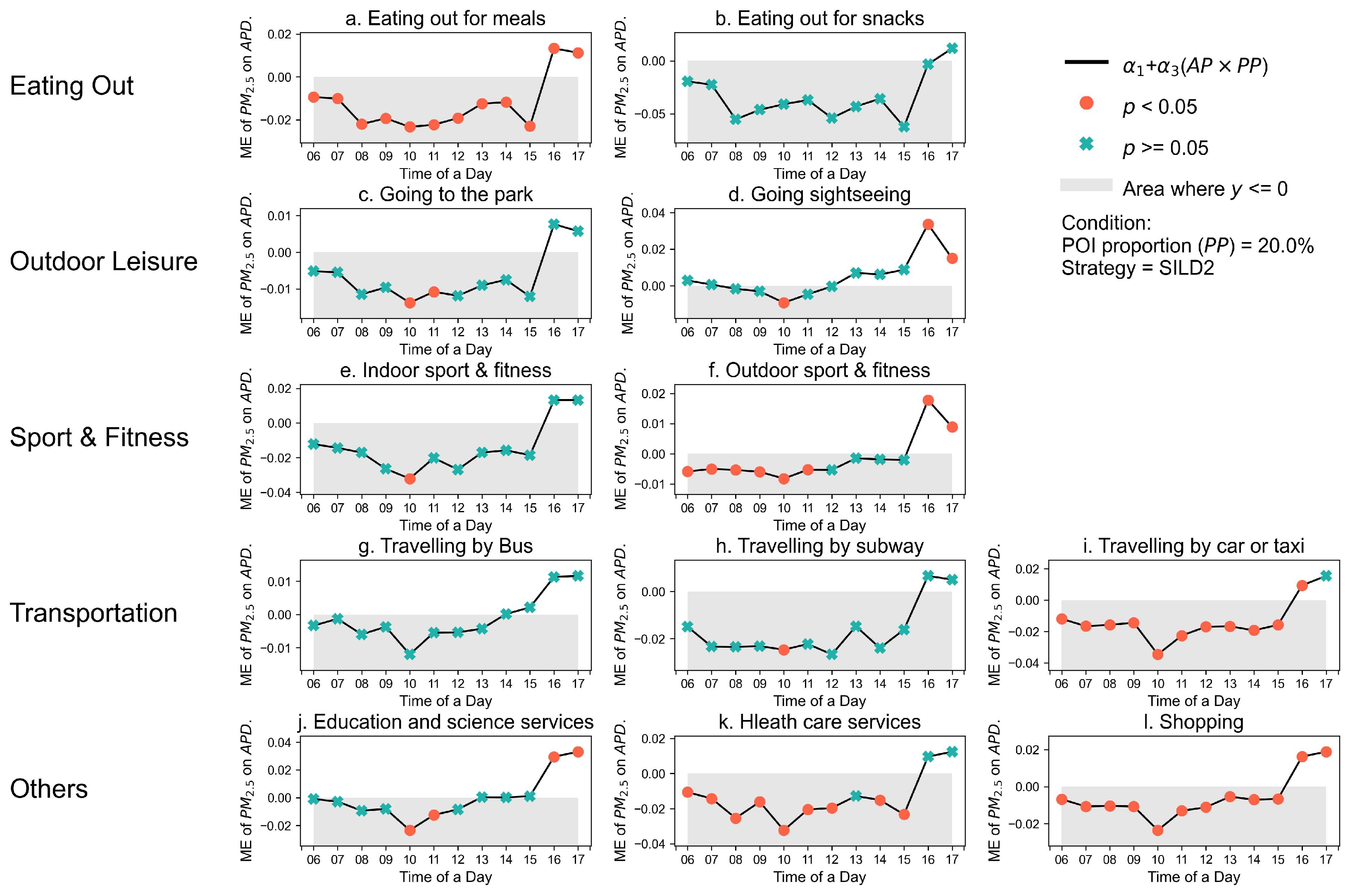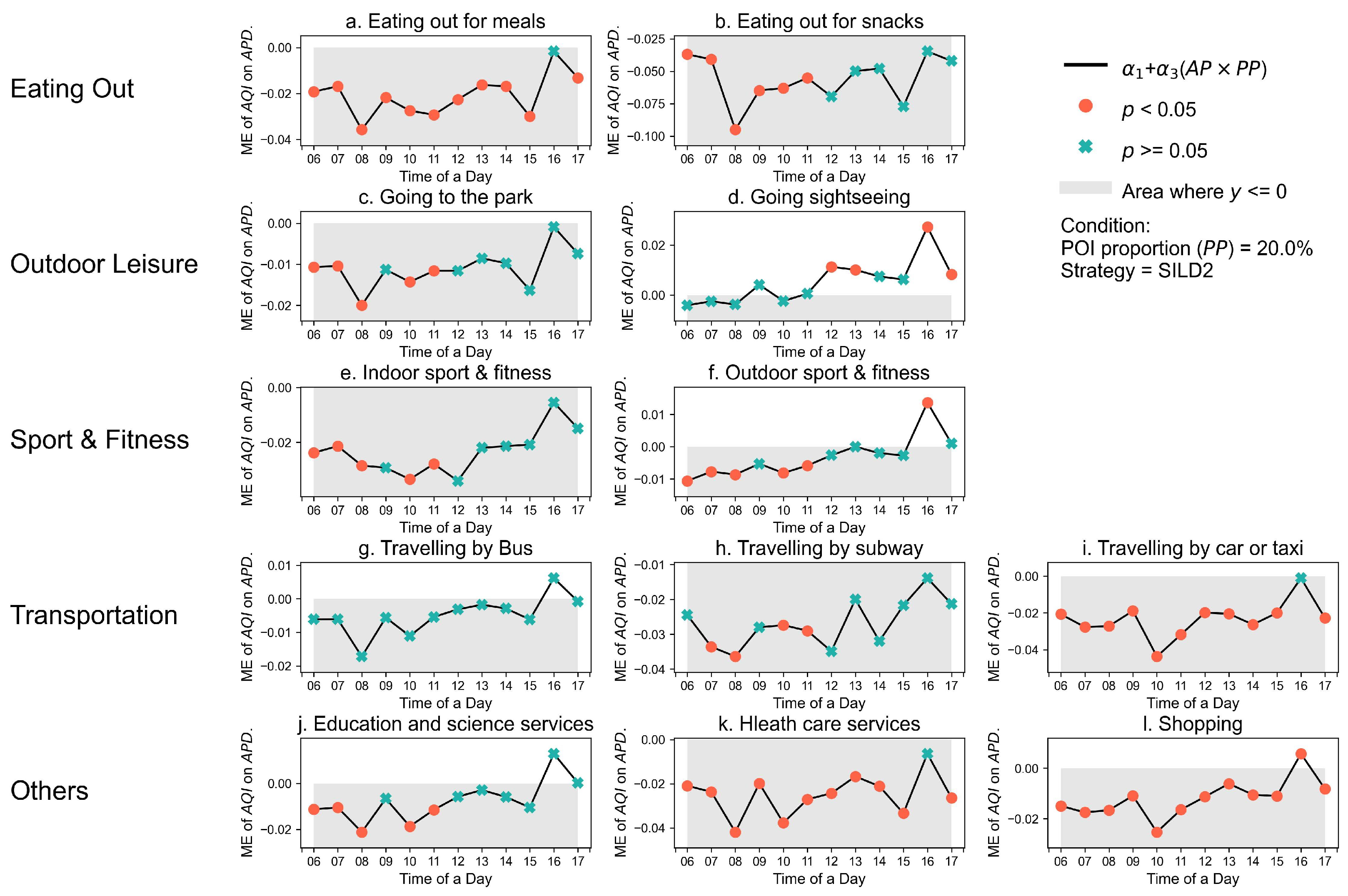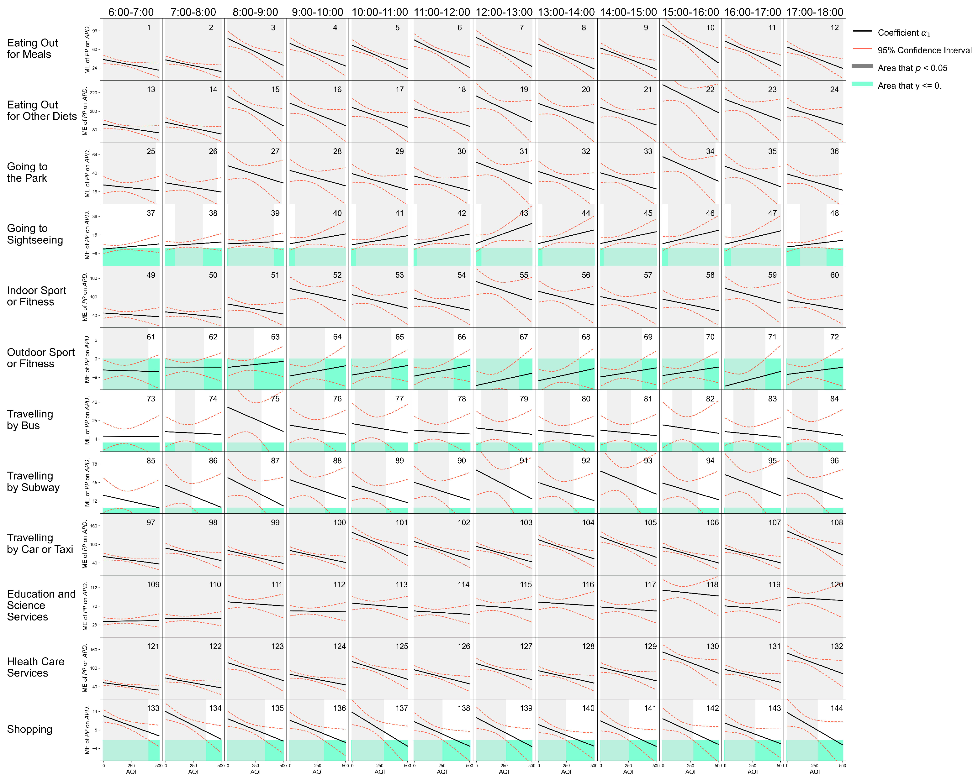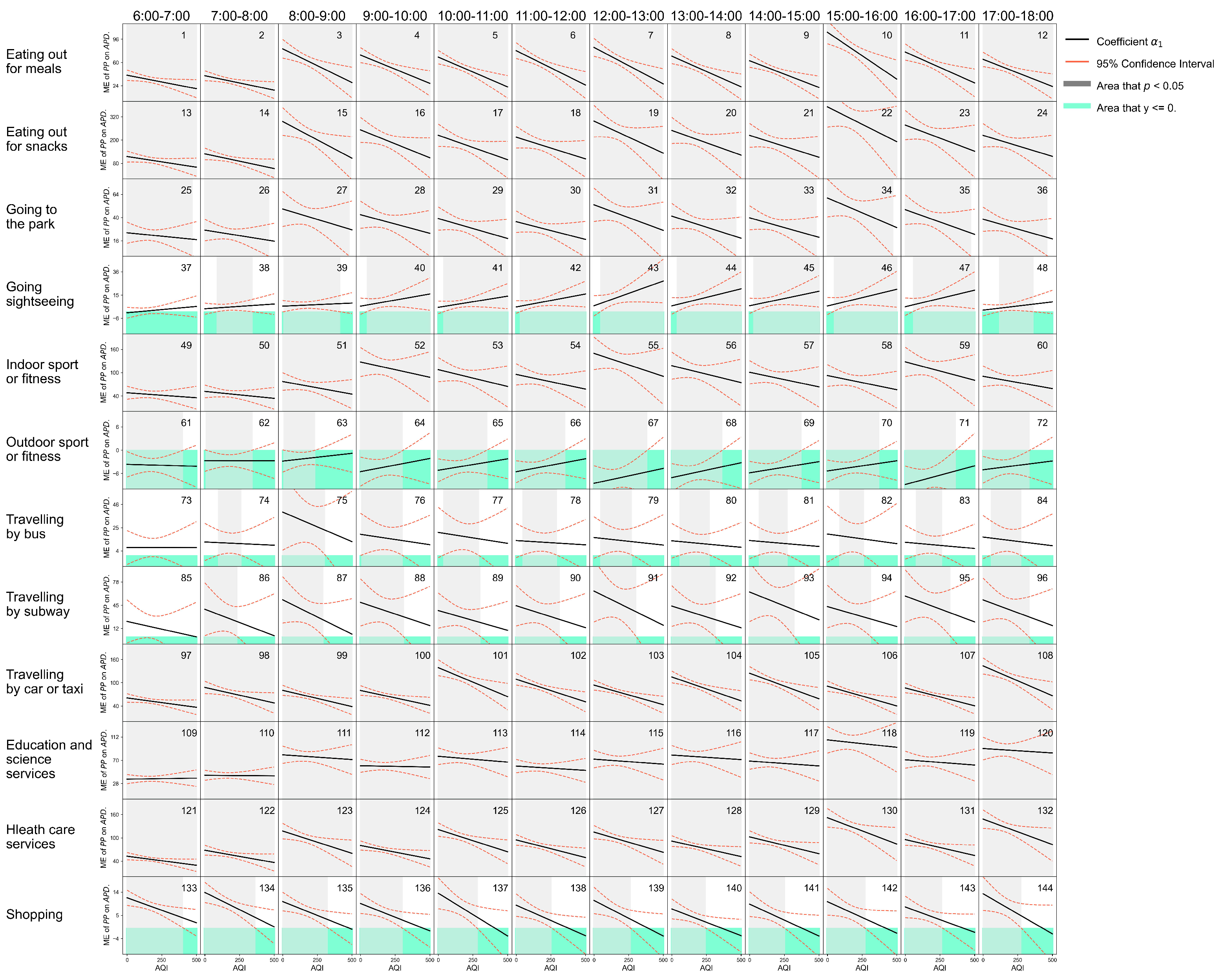 Figure 2 documents that, with the AQI increase, the impact of the POI proportion on APD changes significantly for the grey area, which means the AQI impacts the number of people visiting that type of POI. The simple overall result can qualitatively conclude that the AQI impacts multiple PABs at the same time. However, their impact also depends on the time and the AQI value itself. It means that over a day, the impact of air pollution on a type of PAB changes as time goes by. Further, not all the changes in AQI can cause a significant impact of air pollution on PABs. Also, not all people who participate in the types of PABs will decrease when the air quality becomes worse, some of the PABs, such as going sightseeing are positively impacted by the air pollution, where the positive impact is defined as when the air pollution indicator increases (the air quality becomes worse), and the PAB becomes more active (with a higher people density); the negative impact is defined oppositely.