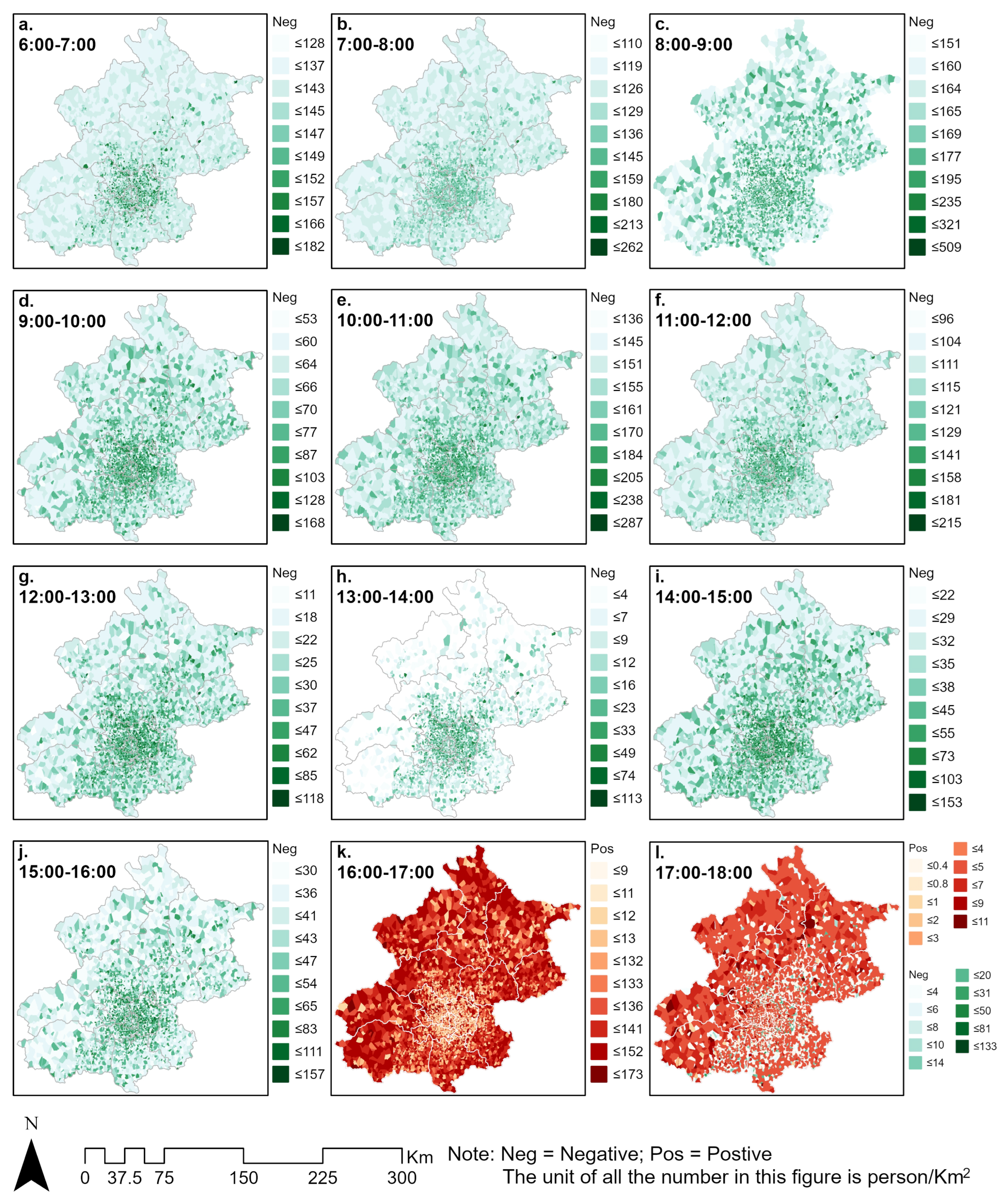 CII distribution indicates the impact is relatively concentrated around the centre of Beijing. Then, from the third TP (8:00–9:00 a.m.), the impact starts to be scattered over the whole of Beijing, with the absolute people density value of PAB overall growing from the maximum of