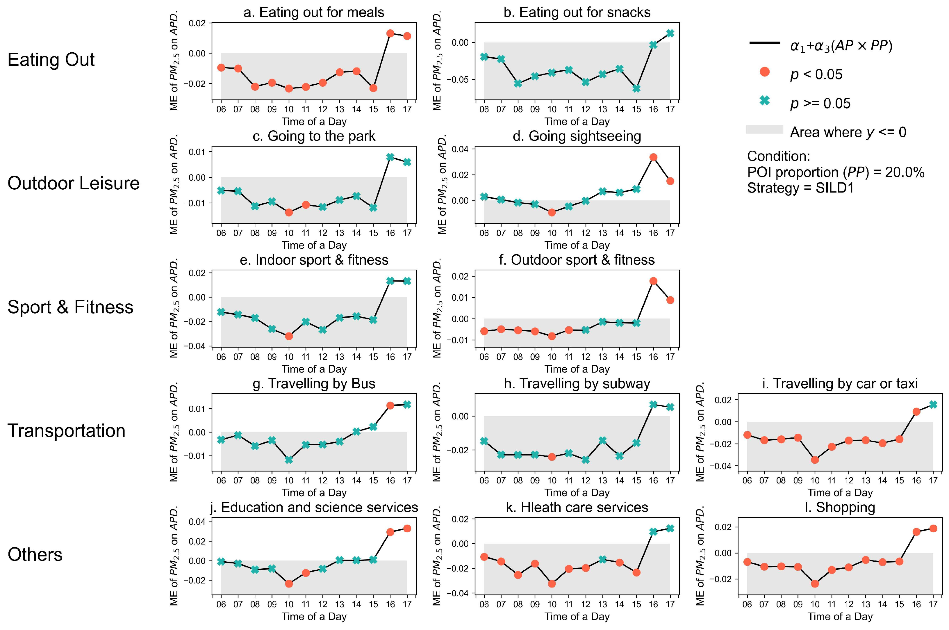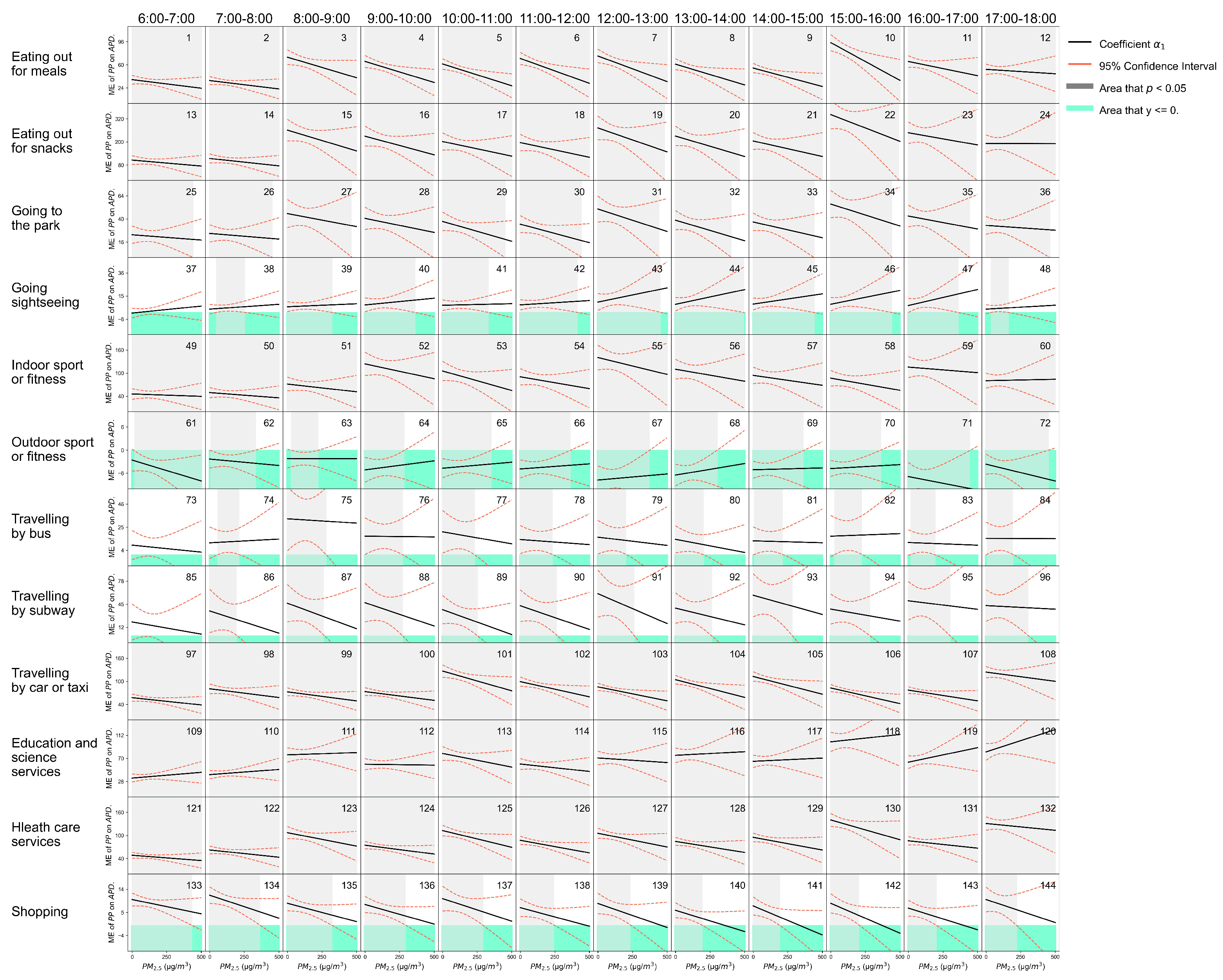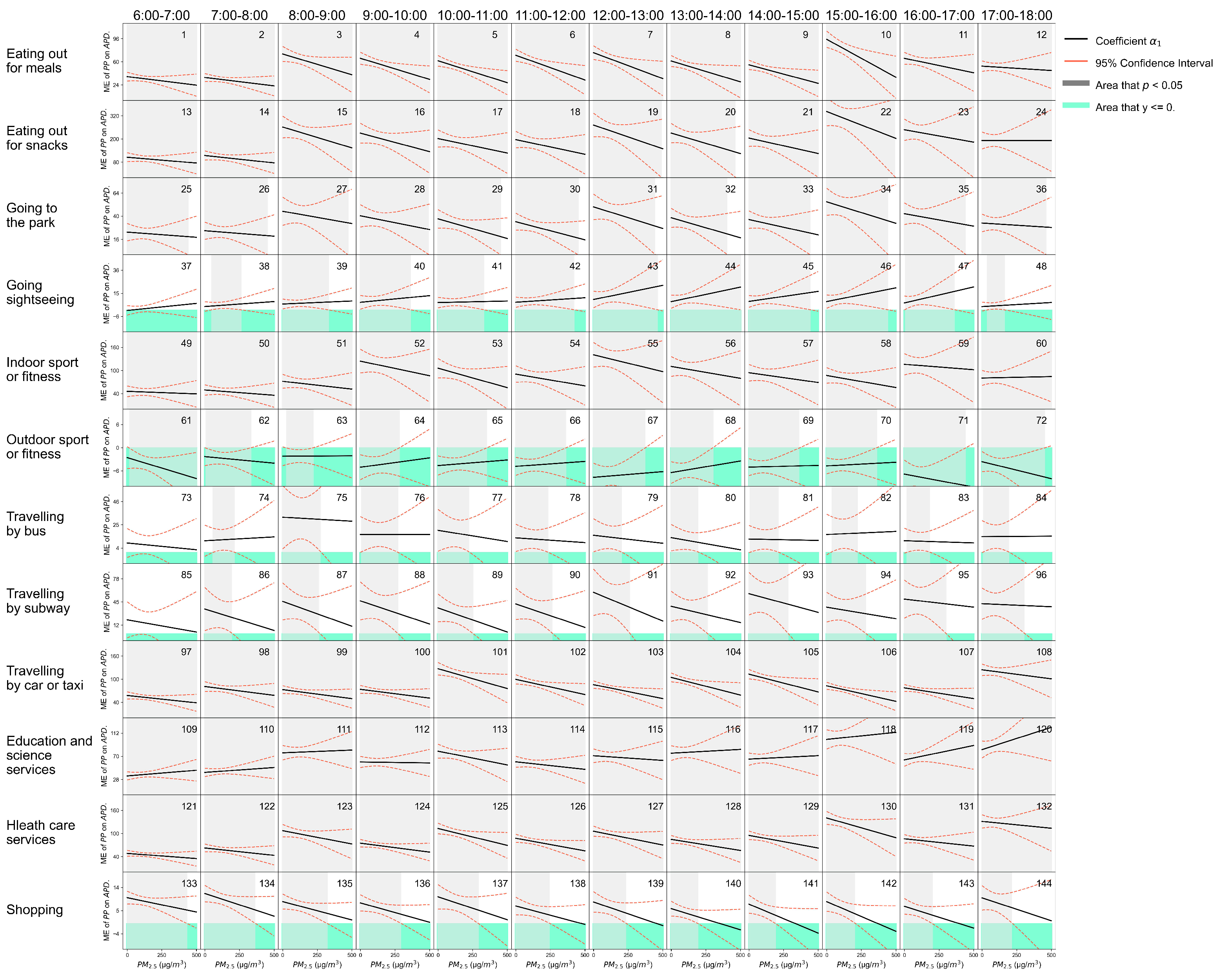 But in terms of other PABs, including outdoor leisure of going sightseeing, outdoor sport or fitness, travelling by bus and subway, and shopping, the significance of the impact of air pollution varies both with AQI and TP. The positive association for sightseeing in certain afternoon hours likely reflects behavioural selection: some visitors may target smoggy periods to avoid crowds and fixed ticket prices. However, this interpretation is correlative. Alternative mechanisms include venue scheduling (e.g., indoor exhibits), AQI misperception, and data-driven density dilution in large scenic VPs. We therefore (i) replicate using PM2.5, (ii) re-estimate with alternative spatial aggregation, and (iii) conduct leave-one-district-out checks. The sign persists but attenuates, suggesting a real yet context-dependent effect that merits targeted field validation.