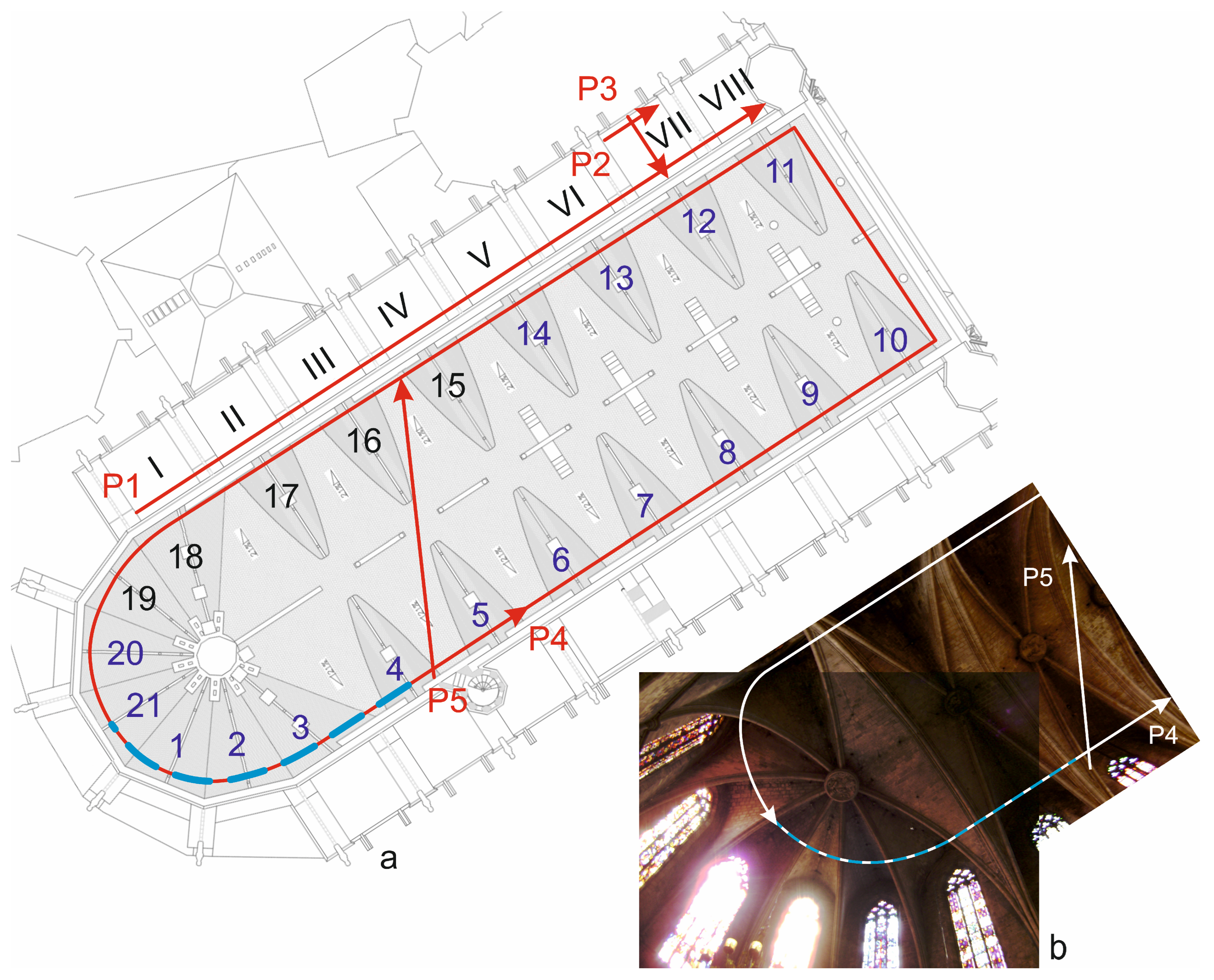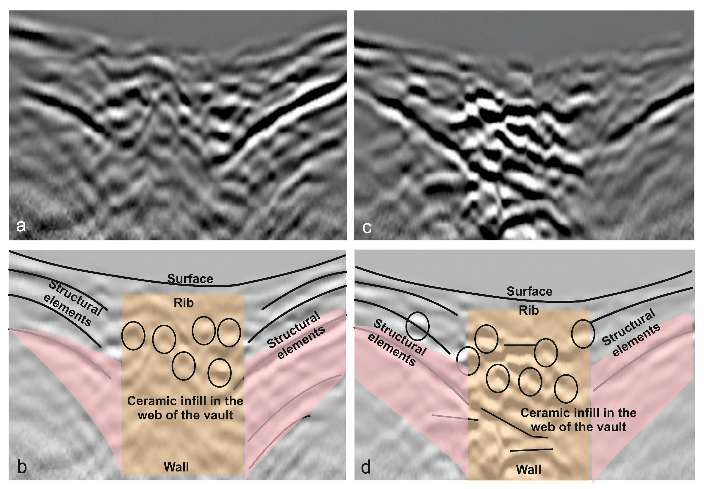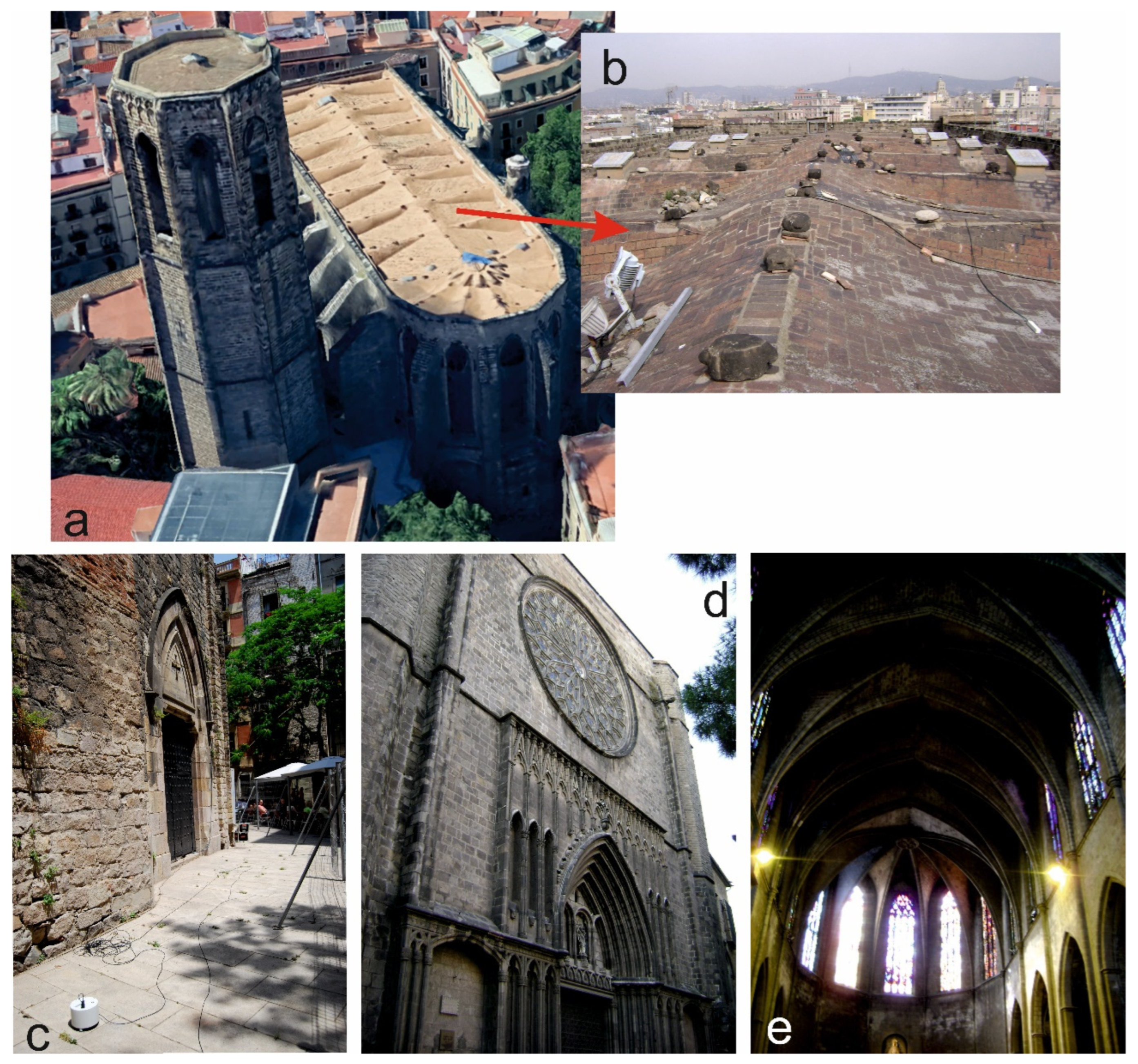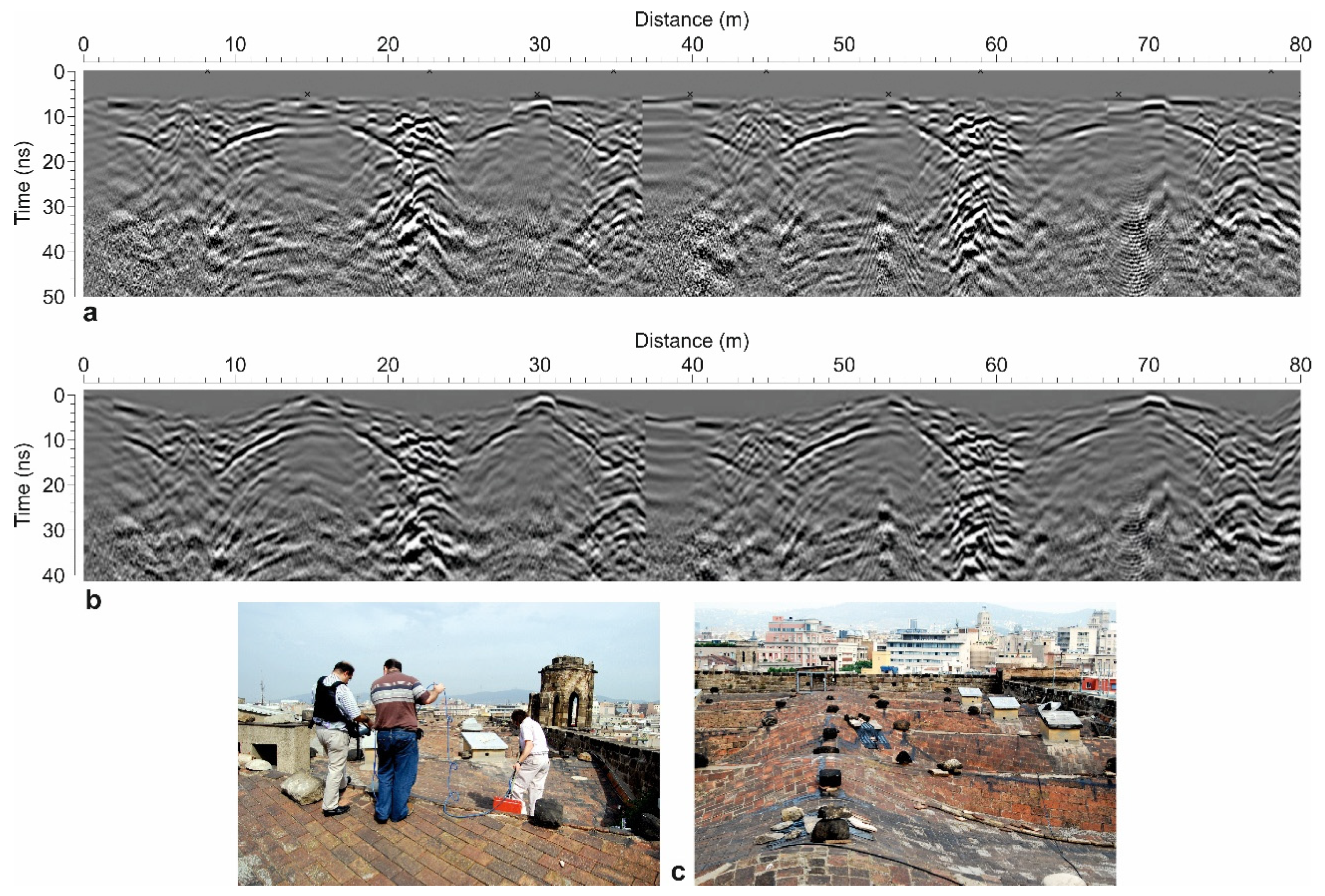 - Perez-Gracia, V.; Santos-Assunçao, S.; Caselles, O.; Clapes, J.; Sossa, V. Combining ground penetrating radar and seismic surveys in the assessment of cultural heritage buildings: The study of roofs, columns, and ground of the gothic church Santa Maria del Mar, in Barcelona (Spain). Struct. Control Health Monit. 2019, 26, e2327. [Google Scholar] [CrossRef]