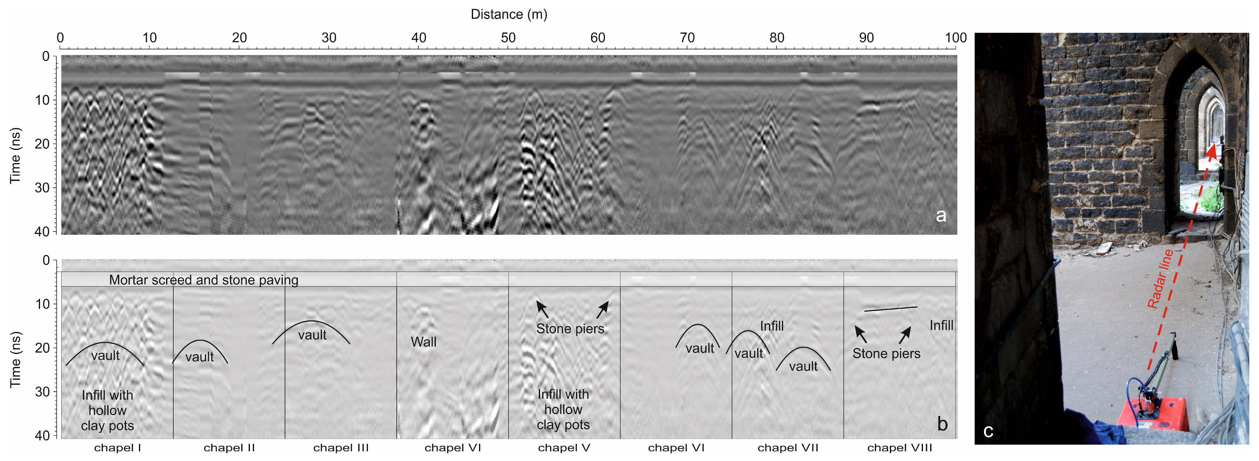 - Utsi, E.C.; Penman, M. Combining Ground Penetrating Radar Data with Historical Research: The Scottish Royal Benedictine Abbey of Dunfermline. Archaeol. Prospect. 2025, 32, 676–706. [Google Scholar] [CrossRef]