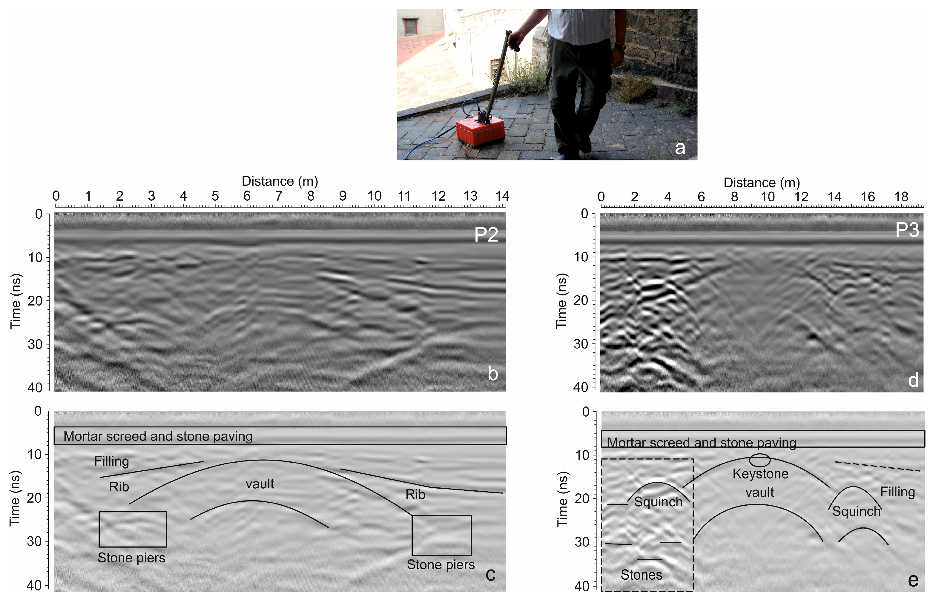 - Solla, M.; Pérez-Gracia, V.; Lagüela, S.; Fontul, S. Applications of the ground-penetrating radar technique to heritage buildings: Case studies and combination with other non-destructive testing. In Diagnosis of Heritage Buildings by Non-Destructive Techniques; Woodhead Publishing: Sawston, UK, 2024; pp. 575–624. [Google Scholar] [CrossRef]