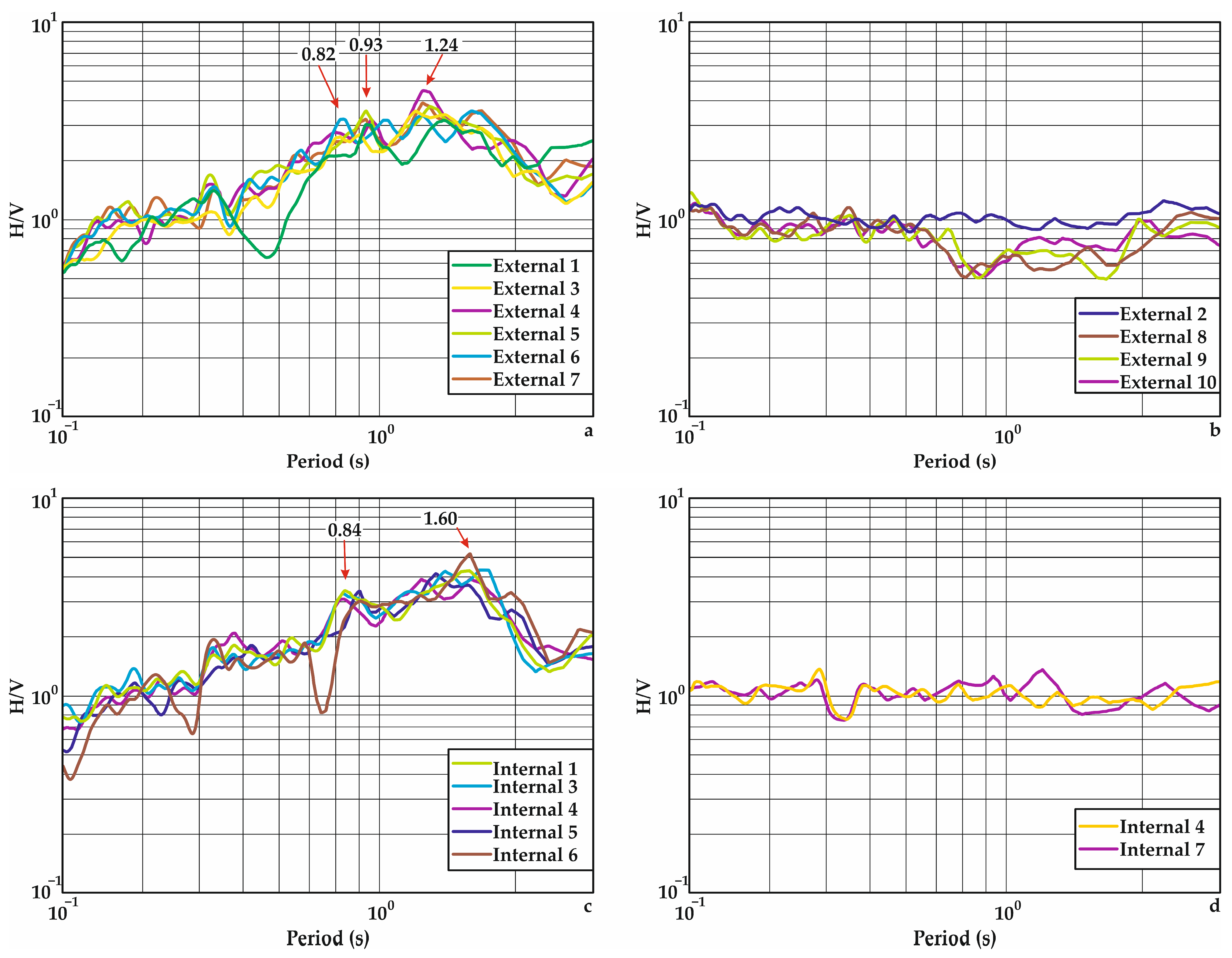 - Babacan, A.E.; Akın, Ö. The investigation of soil–structure resonance of historical buildings using seismic refraction and ambient vibrations HVSR measurements: A case study from Trabzon in Turkey. Acta Geophys. 2018, 66, 1413–1433. [Google Scholar] [CrossRef]
