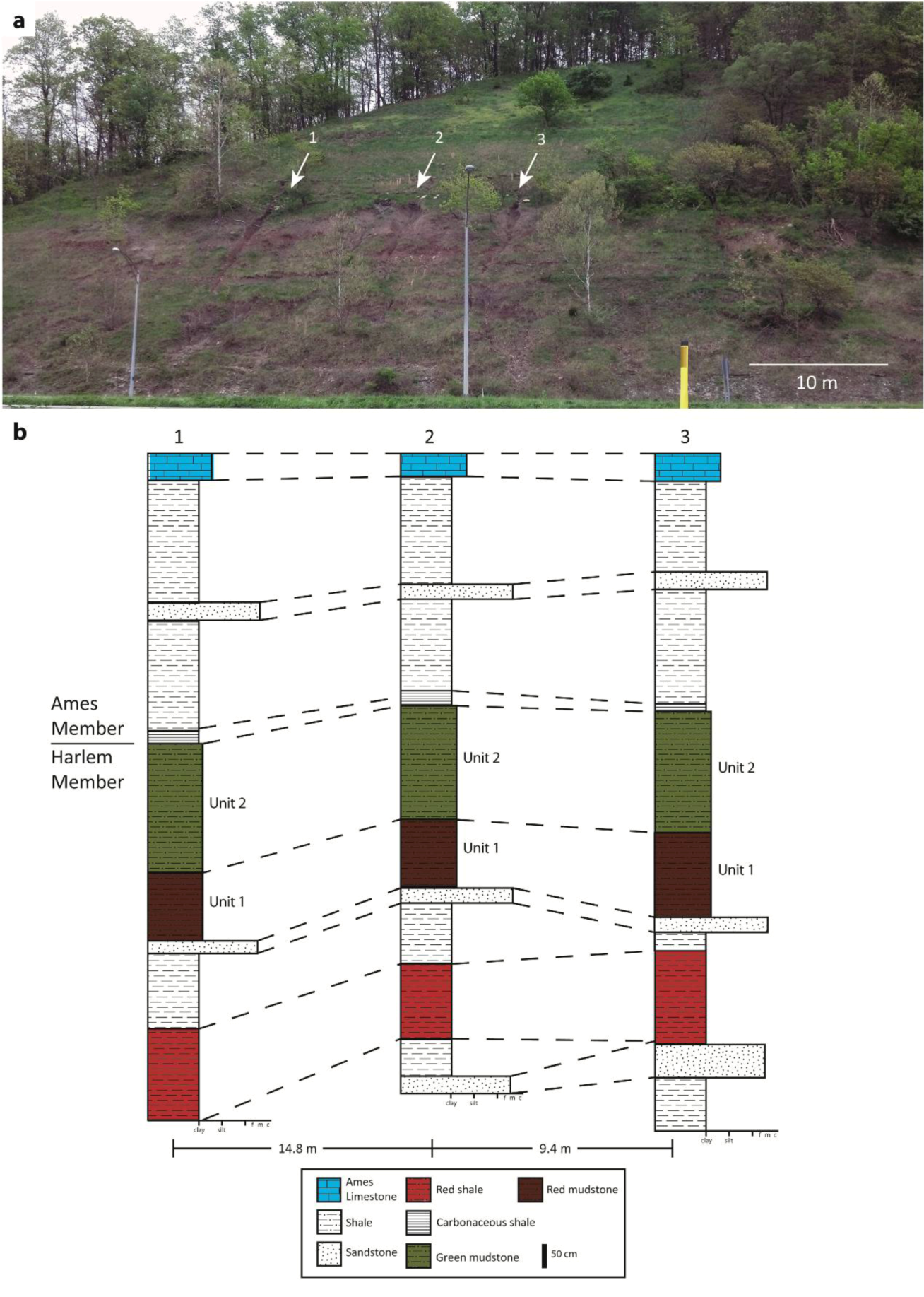 Field location and general stratigraphic columns of the three sections excavated. (a) Field location at Highway 33/Stimson Avenue exit in Athens County, OH, USA. The arrows point to the excavated sections; (b) General stratigraphic columns of the three section which were excavated below the Ames limestone.