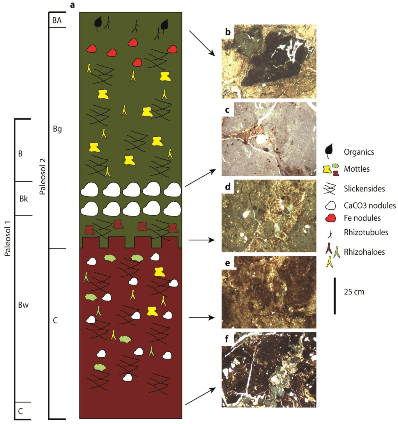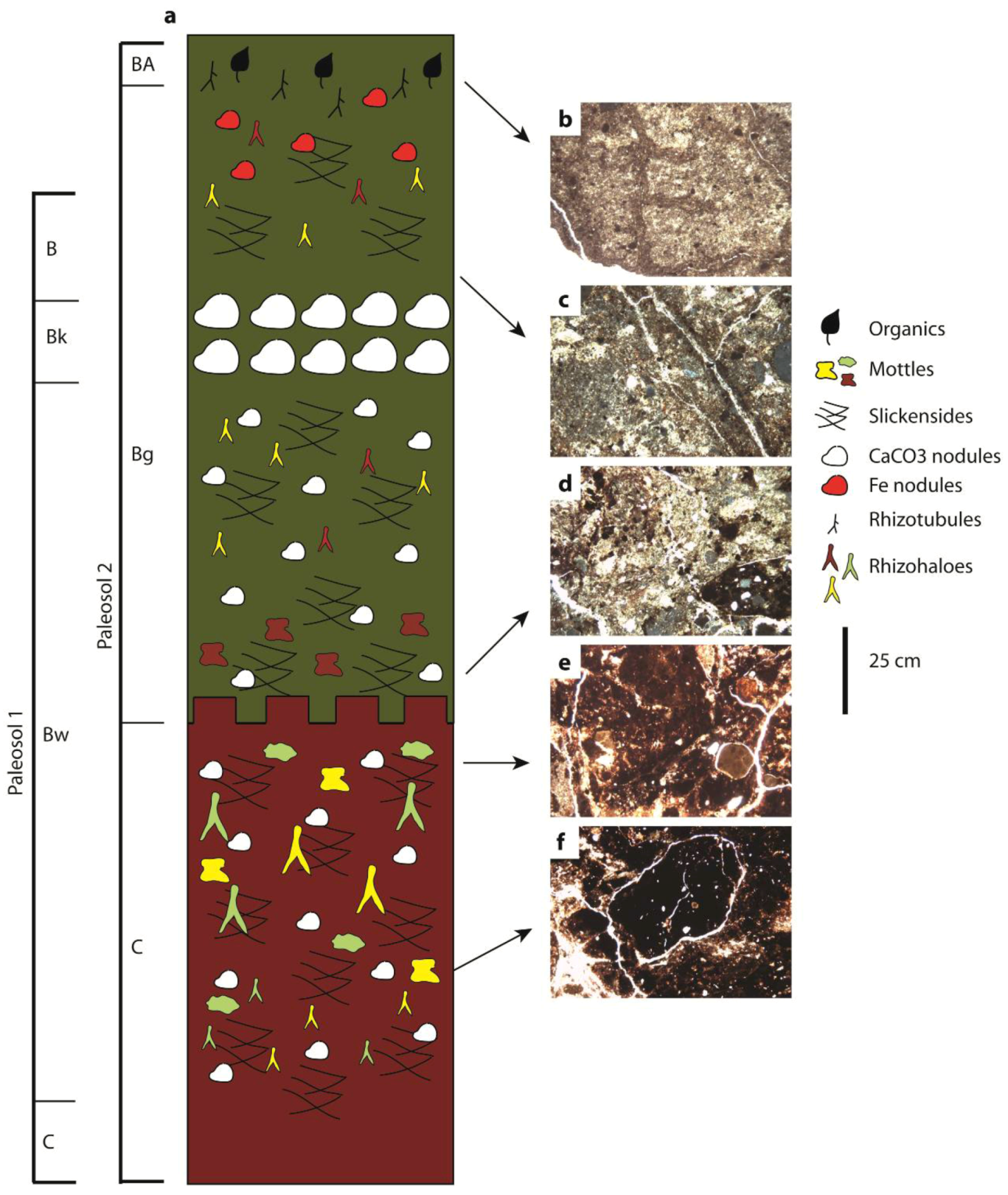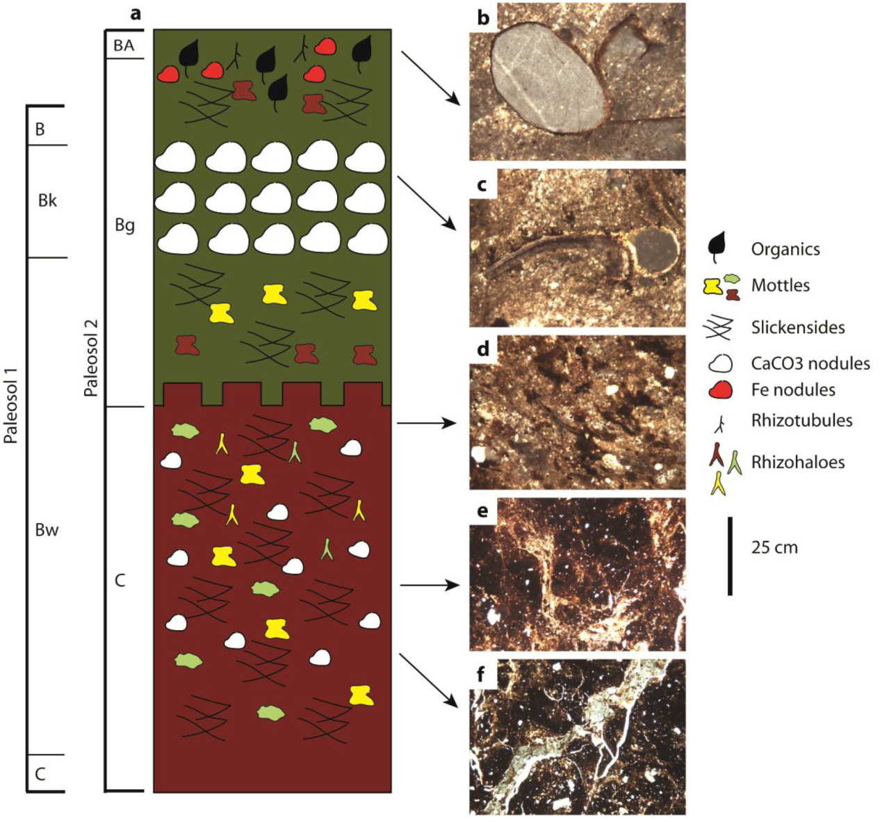 This is suggested by the presence of abundant mottling in hand sample and thin section. Due to the lack of distinct morphological features, however, it is difficult to distinguish whether theses biogenic traces were produced by roots or soil animals. Both mottles and rhizoliths become less abundant towards the bottom of Paleosol 1 in conjunction with the beginning of the C horizon.