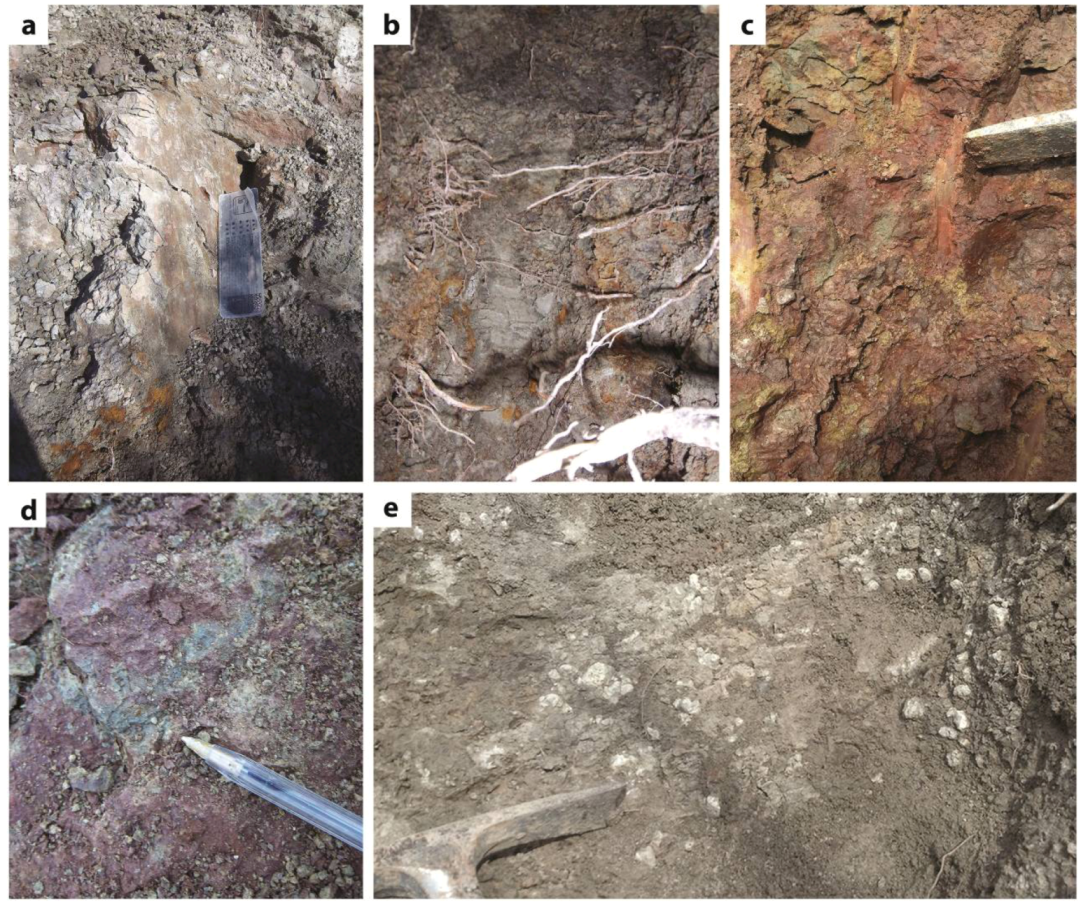 Pedogenic features observed in the field. (a) Large, exposed slickenside surface (16 × 25 cm) in Section 1 within Unit 1; (b) Green-grey color (gley) of the mudstone of Unit 2 in Section 1; (c) Angular blocky texture of Unit 1 in Section 1 with green and yellow mottles; (d) Drab colored mottle present in the upper portion of Unit 1 in Section 1; (e) Horizon of carbonate nodules weathering out of Unit 2 in Section 2.
