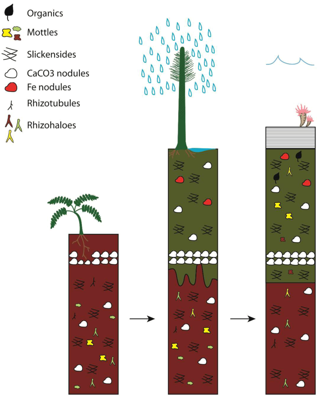 This change in climate resulted in an increased amount of water entering the soil profile (Figure 8b). The relict carbonate horizon would have provided a barrier for much of the water, creating a poorly drained profile and effectively waterlogging the soil above over time especially during the wet season [9,10]. Continued sedimentation along with bioturbation during the climate shift maintained steady rates of aggradation and pedogenesis which is indicated by the preservation of organics and sparse root traces that represent the patchy vegetation inhabiting the changing soil. Over time, a transgressive event occurred, ending soil formation and resulting in the deposition of the overlying carbonaceous shale (Figure 8c).