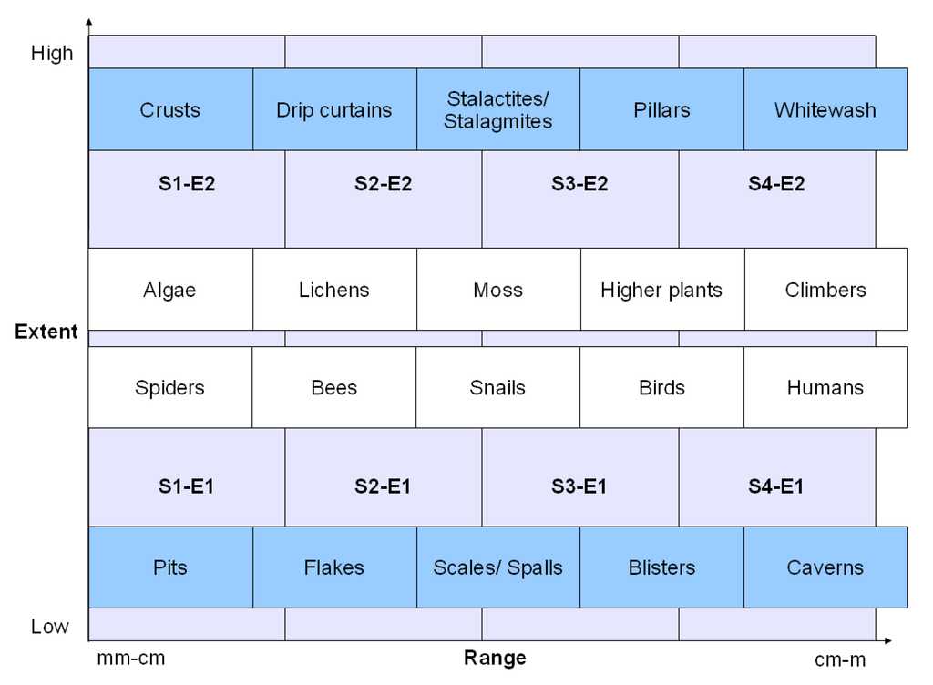 The weathering index derived from this approach, the S-E index, appears in Figure 1 and comprises five decay features, including pits, flakes, scales, blisters, and caverns, that are low in extent at varying sizes (ranging from mm-cm to cm-m, or more specifically from 2 mm to 2 m). Soiling is considered to be high in extent and ranges from dark to light colouration (representing the deteriorative process of dissolution), encompassing crusts, drip curtains, stalactites/ stalagmites (depending on whether rain-washing and dissolution are occurring from above or below, respectively), pillars, and whitewash (when surfaces have been rain-washed back to their original colour). In either direction of extent and ranging upwards in size are biological colonizers, including algae, lichens, moss, higher plants, and climbers.