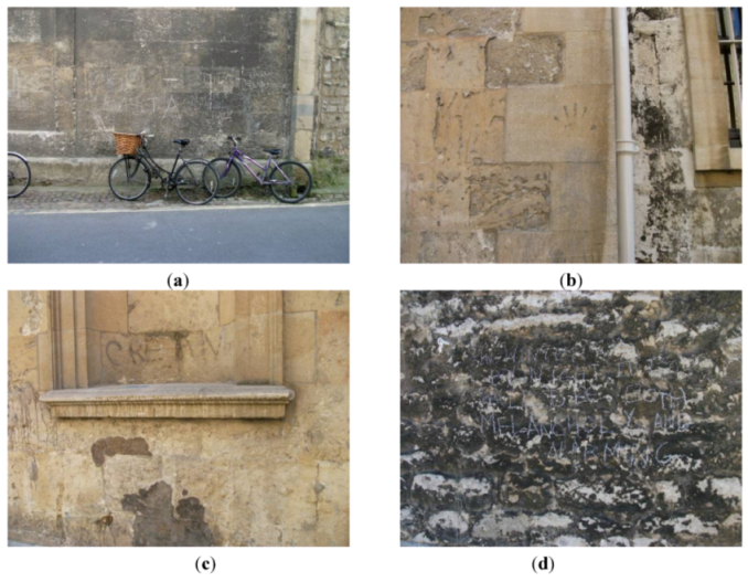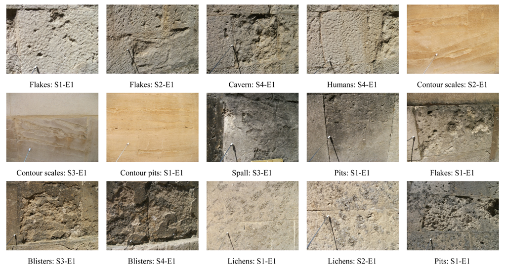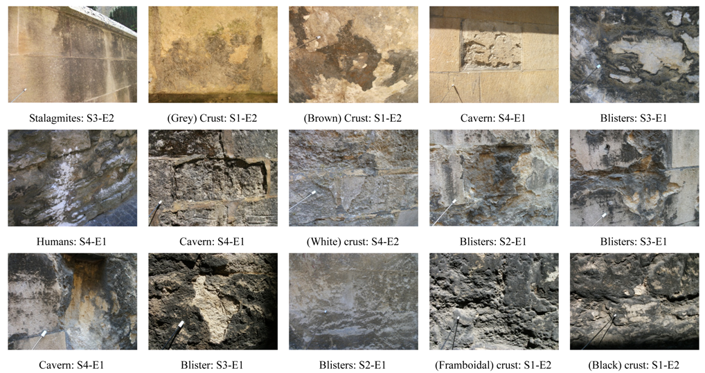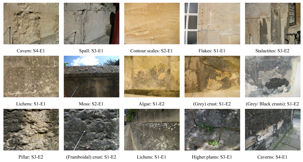 Engineers have already devised a classification of in-situ rocks that includes limestone [12] based on physical and mineralogical descriptions, unit weights, absorption, strength, modulus of elasticity, and sonic velocities and also considers geological discontinuities (joints, faults, and weathered rock). This study incorporated borehole photography in addition to geophysical testing, water pressure testing, and geological mapping. The Building Research Establishment (BRE), UK uses weight loss as indicative of limestone durability class [13], as in the sodium sulphate crystallisation test. Fookes and Hawkins [14] considered weathering by solution of (Palaeozoic) limestones, presenting a simple engineering classification of solution features. Figueiredo and colleagues [15] established a typology for cultural heritage based on major weathering forms visible at the Basílica da Estrela in Lisbon, Portugal, which included consideration of the causes and processes involved. They used textures of grey-level images for image analysis through covariance and granulometry operators to discover that physical weathering forms prevailed inside the church, but also found some evidence of salt weathering. These authors also conveyed that Cretaceous limestone was most deteriorated (than Jurassic limestone).