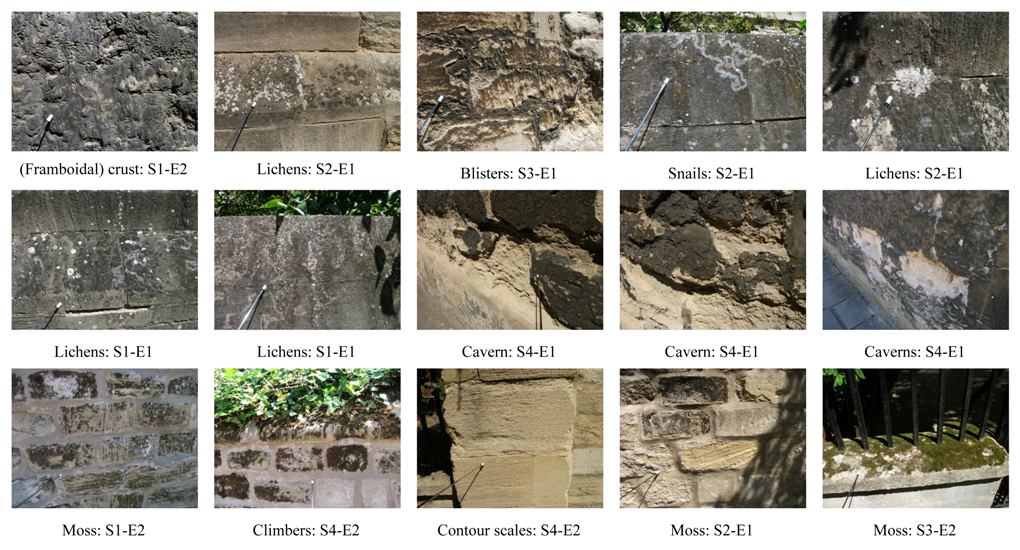 In a photographic survey, it was possible to portray a variety of soiling (degradation) and decay (deterioration) features, representing a range of sizes and extent. For surfaces with a low extent of decay forms, pits, flakes, scales, blisters, and caverns were identified; and for a high extent soiling forms included surface alteration by crusts (of different colours), drip curtains, stalactites/ stalagmites, pillars, and whitewash were visible. These features could be developed by vegetation, including algae, lichens, mosses, small plants, and higher plants, such as climbers. Respective weathering forms were identified at the micro- to mesoscale and classified according to the S-E index.