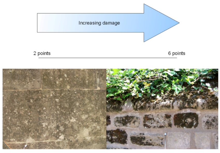 In a photographic survey, it was possible to portray a variety of soiling (degradation) and decay (deterioration) features, representing a range of sizes and extent. For surfaces with a low extent of decay forms, pits, flakes, scales, blisters, and caverns were identified; and for a high extent soiling forms included surface alteration by crusts (of different colours), drip curtains, stalactites/ stalagmites, pillars, and whitewash were visible. These features could be developed by vegetation, including algae, lichens, mosses, small plants, and higher plants, such as climbers. Respective weathering forms were identified at the micro- to mesoscale and classified according to the S-E index.
