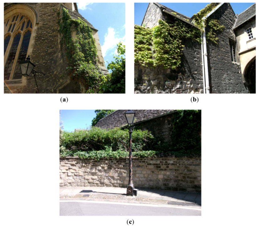 Climbing plants (climbers) along the lane, including (a) ivy at St Edmund Hall; (b) creeper in the grounds of Queen’s College and (c) ivy at New College.