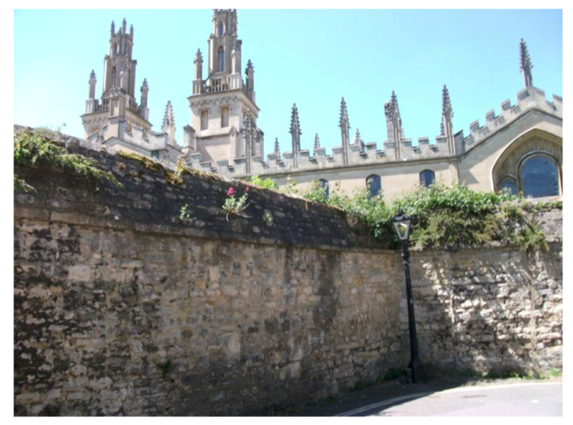 Because the stone-work at this location has remained largely intact over the years (devoid of cleaning and restoration different from college façades along major frontages) it has retained grown (mature) weathering forms, such as soiling (encrustation and discolouration). In addition to these grown features, vegetation has colonized the walls, with larger biological cover growing extensively (except for lichens and patches of moss). As exceptions, it is noteworthy to mention that building façades appear only somewhat cleaner towards High Street, especially evident at St. Edmund Hall, which was recently refronted, and at Hertford College towards the popular tourist route along Catte Street (Figure 3). Nevertheless, even on such recently cleaned/ refaced stone-work, there is evidence of smaller decay features (pits, flakes, and scales). This effect is also evident elsewhere in central Oxford, for instance at the southern façade of the Ashmolean Museum, which was recently cleaned. Even though soiling is removed (and evidence of extensive forms of weathering cleared), smaller (decay) forms remain, including pits, flakes, and some scales on its plinth. Elsewhere, as along the boundary wall of Magdalen College along Longwall Street, cleaning led to cavernous weathering once surface crusts (binding and holding material together) were breached.