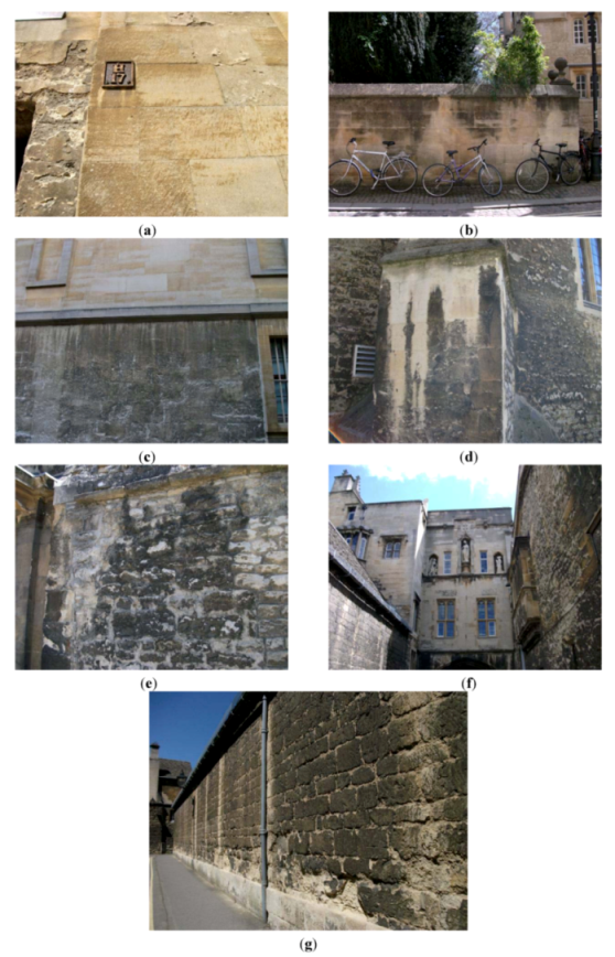 Engineers have already devised a classification of in-situ rocks that includes limestone [12] based on physical and mineralogical descriptions, unit weights, absorption, strength, modulus of elasticity, and sonic velocities and also considers geological discontinuities (joints, faults, and weathered rock). This study incorporated borehole photography in addition to geophysical testing, water pressure testing, and geological mapping. The Building Research Establishment (BRE), UK uses weight loss as indicative of limestone durability class [13], as in the sodium sulphate crystallisation test. Fookes and Hawkins [14] considered weathering by solution of (Palaeozoic) limestones, presenting a simple engineering classification of solution features. Figueiredo and colleagues [15] established a typology for cultural heritage based on major weathering forms visible at the Basílica da Estrela in Lisbon, Portugal, which included consideration of the causes and processes involved. They used textures of grey-level images for image analysis through covariance and granulometry operators to discover that physical weathering forms prevailed inside the church, but also found some evidence of salt weathering. These authors also conveyed that Cretaceous limestone was most deteriorated (than Jurassic limestone).