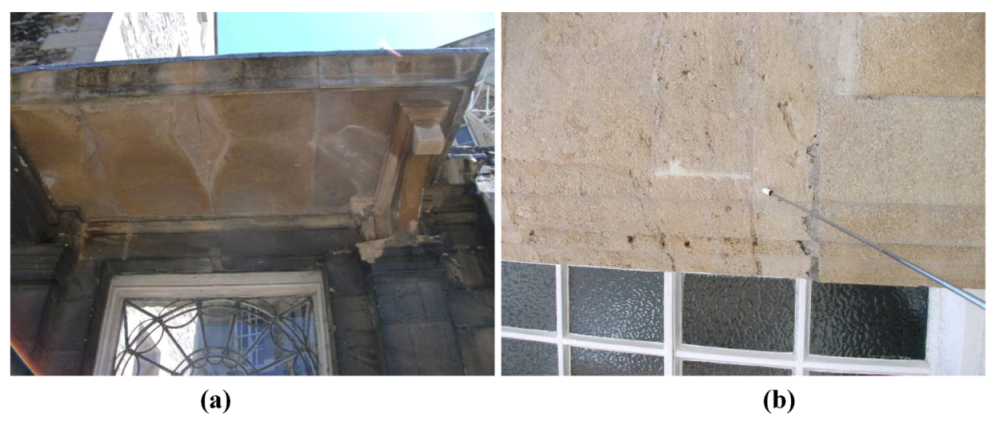 Mainly decay features have been mapped and classified in the published literature. For instance, Török focused on different types of crusts (e.g., black encrustations, white crusts, etc.) of soft oolitic limestone [5,6] as well as travertine [7] and tuffs [8]. Akin and Ozsan also classified travertine [9], specifically Eskipazar yellow traverine, which is widely used in Turkey. Additionally, granite (and other igneous rocks) has been frequently classified when compared to limestone. For example, Sousa and colleagues [10] devised the linear crack density (LCD) index, as a physical weathering classification system, which defines the number of cracks per length unit. Nonlinear models have also been employed to classify Turkish granitic rocks, e.g., [11], including statistical (nonlinear regression) and soft computing methods (employing artificial neural networks and the adaptive neurofuzzy inference system).