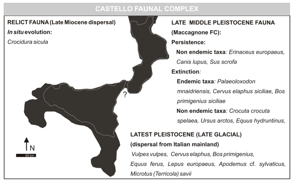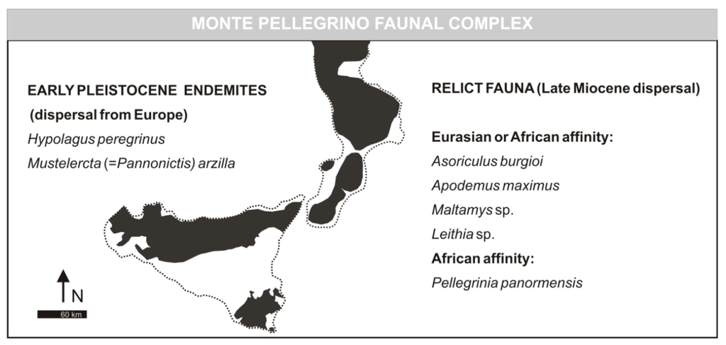 The Monte Pellegrino faunal complex is likely from the early Pleistocene age and its fauna is endemic, unbalanced, and poorly diversified, mainly composed by small mammals (Figure 4).