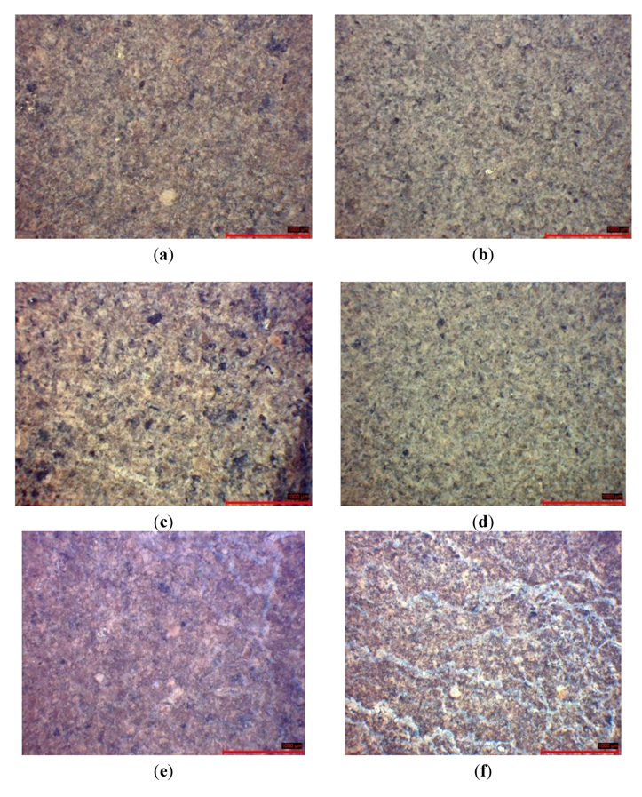 The stereoscopic optical examination was especially revealing of a gradual differentiation of the glass-like texture for the untreated sandstone sample (Figure 1a) to the whitish, crusted, “fluffy” substratum (Figure 1f). This texture is fully harmonized by the higher nanosilica content from 0 to 2.5 w/w %. Initially the color of the sandstone was a green/gray color but, due to the nanoparticles increase, it turned to a light grey/green with whitish layer/crust on the mineral surface. The higher the content of nanoparticles, the more marked was the phenomenon of the white crust. The layer was uniformly applied and no density differences were recorded (Figure 1b–f).