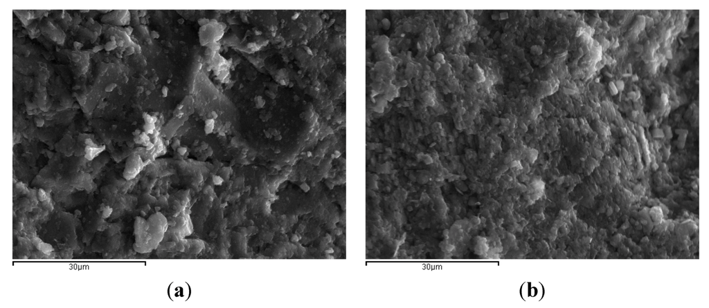 SEM analysis performed on the samples indicates small differences in the structure of the untreated sample and the sample treated with the neat hydrophobic material. Large angular crystals of feldspars prevail in the structure of the sandstone while the coating of hydrophobic material uniformly covers the surfaces, making the crystals look smaller and restricting the pores between them (Figure 2).