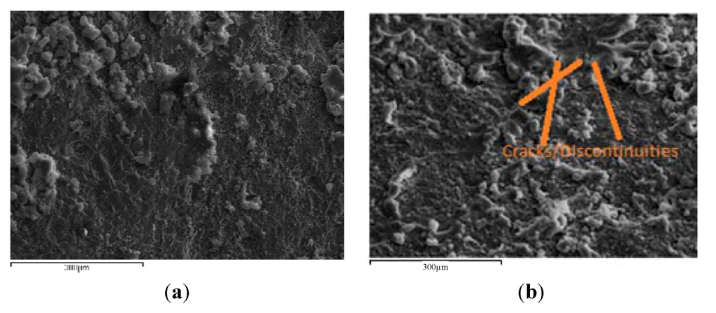 (a) Surface of D4 sample and (b) surface of D6 sample under SEM.