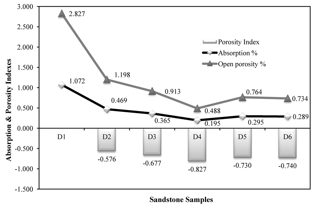 The water absorption test was performed under vacuum, according to RILEM CPC11.3 and Table 4 contains the results while Figure 4 gives the relation between the absorption and the porosity. The method of liquid (usually distilled water) absorption in order to measure open porosity is quick, cost effective, and reliable, since it is easily repeatable [22]. During the procedure of this method, the pore shape does not present any alterations and it is considered trustful when permeability estimation is required. It is based on the concept that the sample weight is due to its absolute mass. Firstly the samples should be dried, and air present should be removed through suction. By filling the pores with a liquid medium of known density at normal temperature, open porosity can be calculated from the weight change. The assumption of this method is that only connected pores open to the surface of the sample can be measured, and only pores (not solid parts) are filled with the liquid. Samples should be under vacuum in order to extract air and allow liquid to penetrate deeper or into smaller pores.