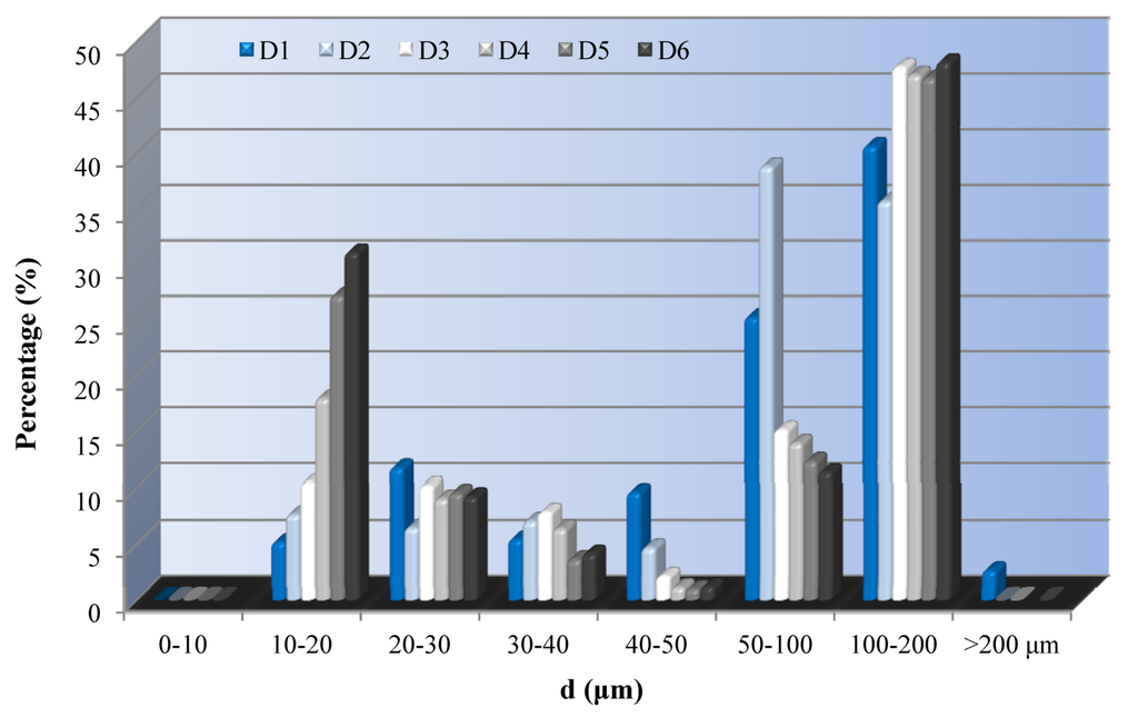 Mercury Intrusion Porosimetry according to ASTM D 4404-84 [23] provides a wide range of pore sizes and properties such as open porosity, mean pore diameter, and bulk density. This technique is the most common one used by researchers in different building materials [24] and has been proved sensitive for comparisons. The pore-size distribution is determined from the volume of mercury intruded at each pressure increment, while the total porosity is based on the total intruded volume. In this case, the untreated Demati sandstone presents a range of pore sizes from 10 μm to 200 μm. All treated samples do not present large pores (>200 μm). Small pores in the area of of <20 μm, samples treated with solution containing 2% nanoparticles (D5) present large amount of pores, while D2 and D4 samples have similar distribution to the untreated stone (Figure 5).