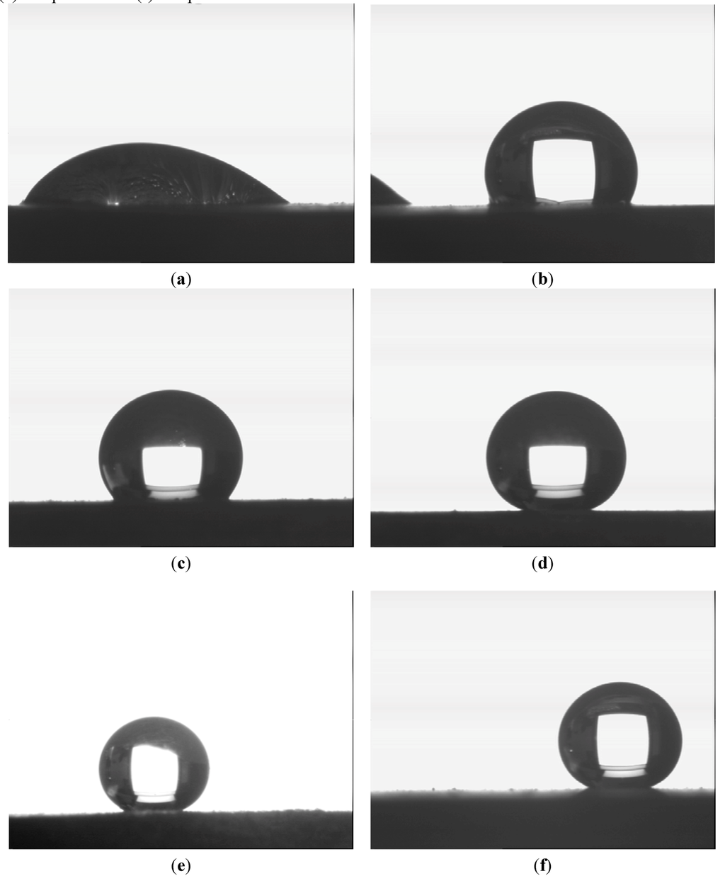 Static contact angle (SCA) of a water drop of untreated (a) sample D1; (b) sample D2; (c) sample D3; (d) sample D4; (e) sample D5 and (f) sample D6.
