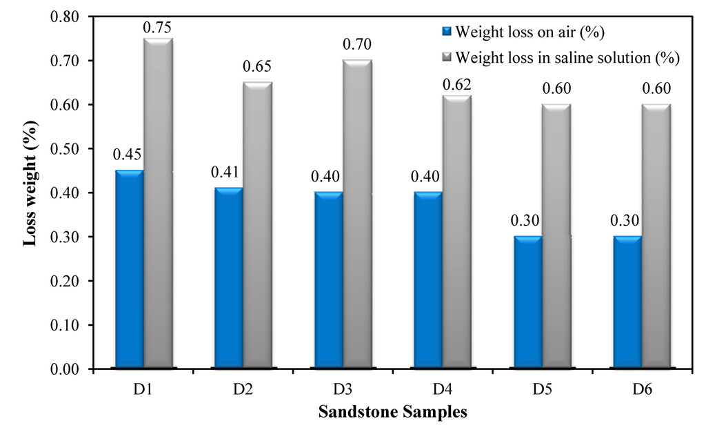 Additionally to air freeze-thaw cycle tests, samples have been subjected to salt fog cycle tests. Because salt fog reaction is essential to weathering mechanisms, such as salt crystallization-deposition onto rock surfaces, or salt solution penetration into rock-pores causing expansion of existing voids in the rock geometry or secondary minerals genesis [25,26]. Thus two series of samples were weighted and put in a climatic chamber in order to subject them to freeze-thaw tests. One was left in air and the other was immersed in a solution of 10% NaCl. In total 260 cycles were performed according to EN12371:2001 [27] from −18 °C to 20 °C. After the end of the program all samples were visually inspected and the loose material of each sample was weighted again. The weight loss data is given in Table 6. All samples lost approximately 0.30–0.45 w/w % of their mass, while were exposed in freeze-thaw cycles in air (Figure 8). Notable, is that minimum loss was observed in samples D5 and D6. The loss of mass was more intense in samples exposed to the saline solution of salt fog. There was an observed loss of approximately 0.60–0.75 w/w % of original weight and samples D5 and D6 were again the most durable.