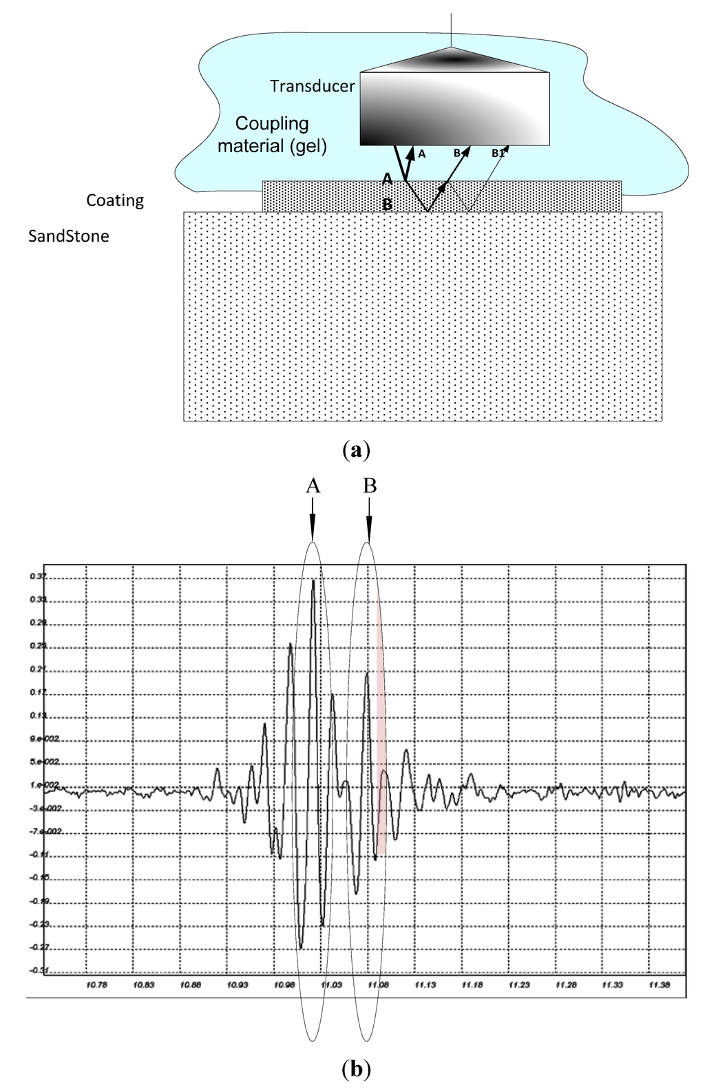 Pulse echo technique used for the thickness measurement of the thin film penetration. (a) Representation of the measurement; In (b) A stands for the echo of the thin film and B stands for the echo of the sandstone.