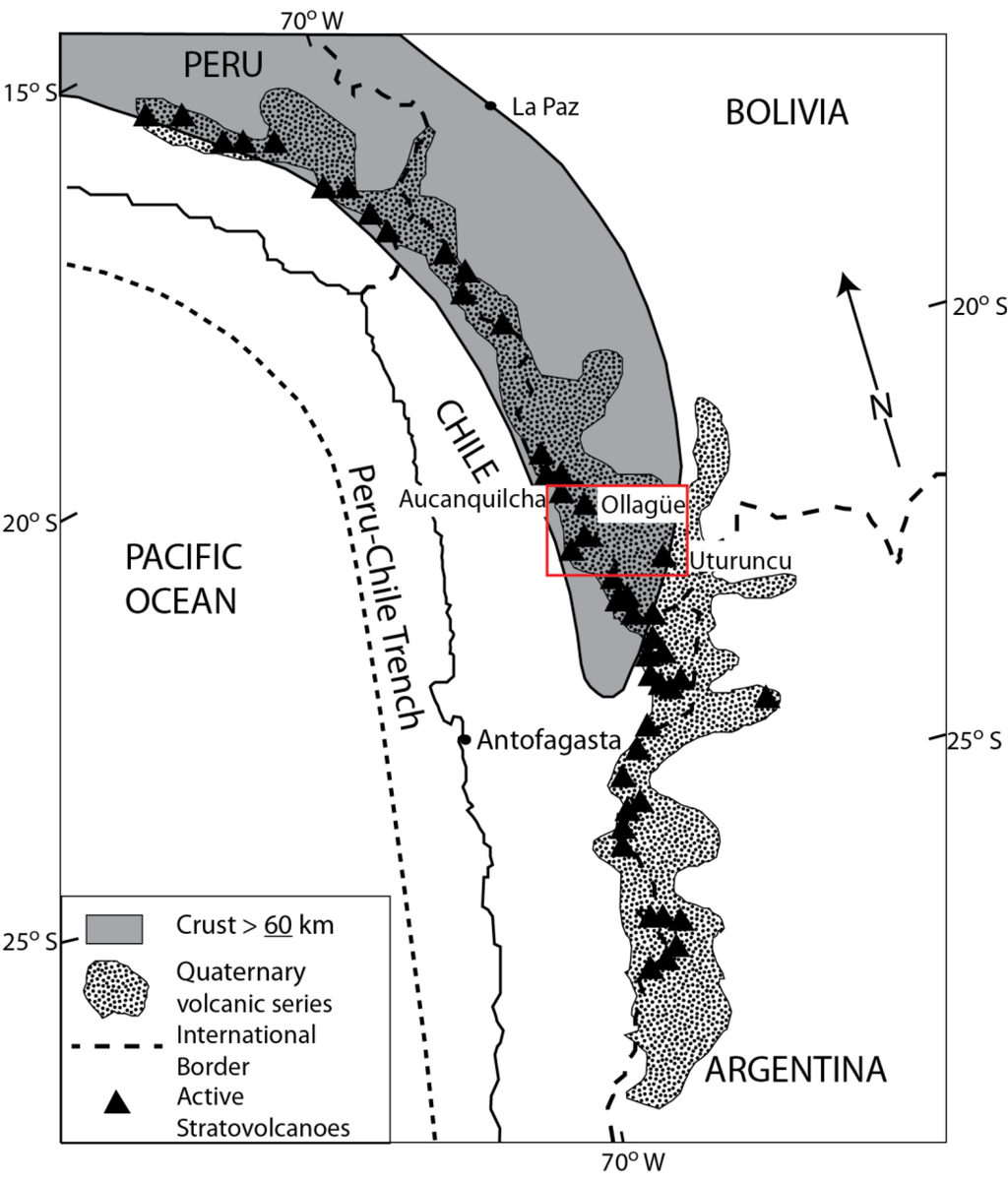 Map showing location of Andean Central Volcanic Zone (CVZ). Shaded area shows the region where crustal thickness exceeds 60 km [,,,]; stippled region illustrates distribution of Quaternary volcanic rocks. Modified from Feeley and Hacker []. Red box highlights the region illustrated in Figure 2.