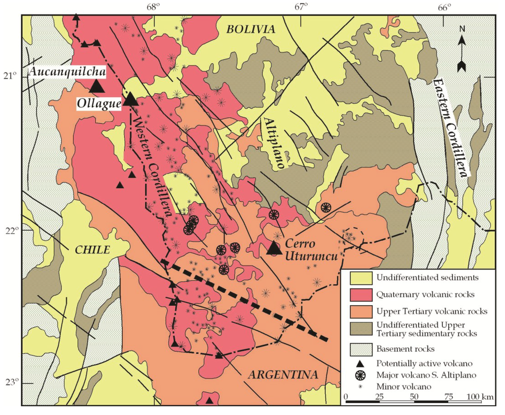 Simplified geologic map of the southern Altiplano and surrounding region (modified from Sparks et al. []). Only potentially active volcanoes as defined by de Silva and Francis [] and volcanoes on the southern Altiplano are illustrated. Labeled volcanic centers are those considered in this study due to the quality of data sets available for other volcanic centers within the study area. The thick dashed line trending NW-SE across the Bolivian-Argentine border is interpreted from Allmendinger et al. [] and is considered to be the general boundary between the Bolivian Altiplano (north) and the Argentine Puna (south).