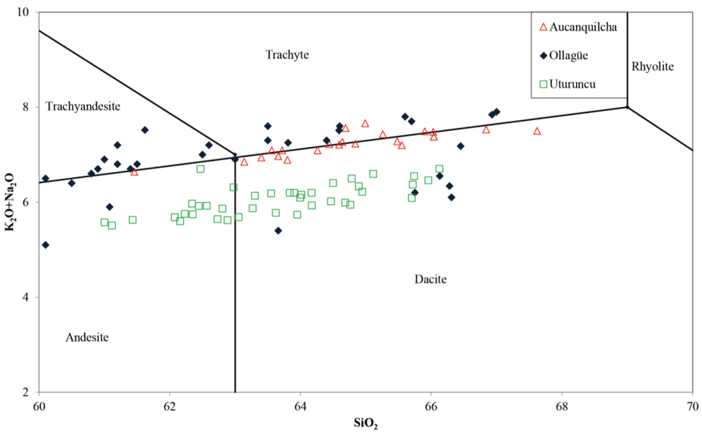Volcanic rocks at Aucanquilcha, Ollagüe, and Uturuncu are high-K, calc-alkaline andesites/trachyandesites and dacites/trachytes, together with less abundant basaltic andesites (Figure 3). Total alkali concentrations of rocks from Aucanquilcha and Ollagüe with 61–68 wt % SiO2 are restricted, ranging from 5.1 to 7.9 wt %, such that they plot along the border of the andesite-dacite/trachyte-trachyandesite fields (Figure 3; [,]). Ollagüe also contains a few rocks that plot in the trachyte and trachyandesite fields, but these are rare (Figure 3; [,]). Silicic rocks at Uturuncu with SiO2 contents from 61 to 68 wt % have lower total alkali concentrations of 5.5–6.7 wt % (as a result of low Na2O concentrations; see below); classifying them as andesitic to dacitic (Figure 3; [,,]).