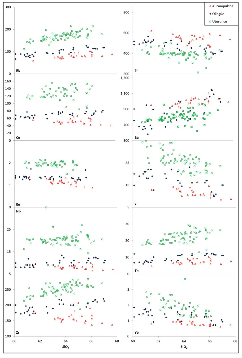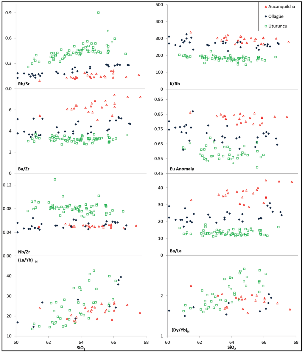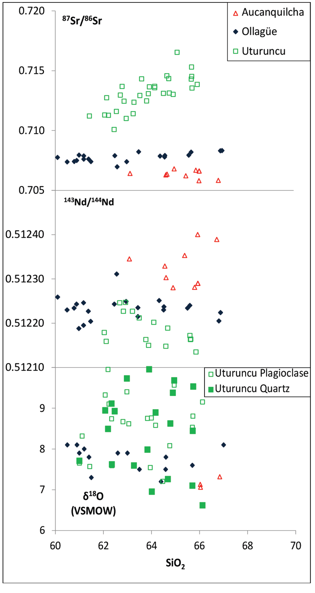 In this section we describe across-arc geochemical and isotopic variations of silicic volcanic rocks (i.e., >60 wt % SiO2) erupted from the three centers. We focus on silicic rocks because more mafic rocks are generally rare or non-existent at the three centers and the silicic rocks better record the compositions of crustal rocks through which the magmas ascended and interacted. Data for magmas erupted at Ollagüe and Aucanquilcha are in Feeley and Davidson [], Feeley and Hacker [], Feeley and Sharp [], Mattoli et al. [], Grunder et al. [], Klemetti and Grunder [], and Vezzoli et al. []. New whole rock and isotopic data are illustrated in this paper for Uturuncu rocks with representative analyses presented in Table 1, Table 2 and Table 3. A complete dataset for new analyses is available in the supplementary information. Additional major and trace element data for Uturuncu rocks are in Sparks et al. [].