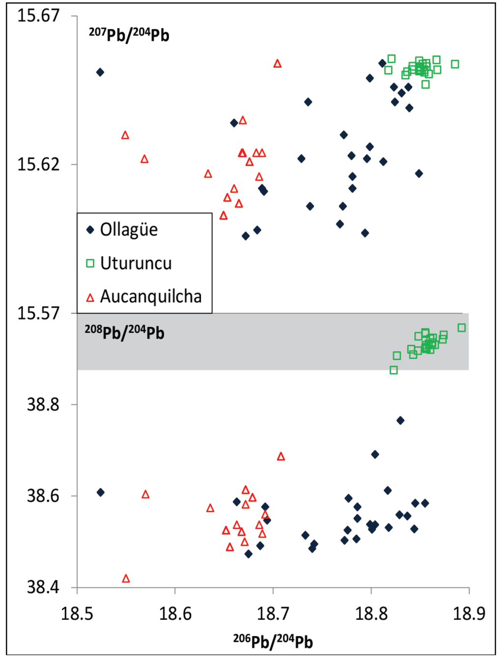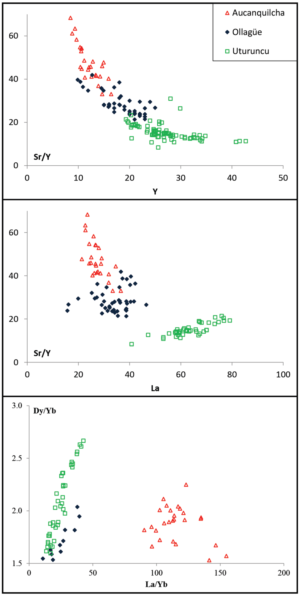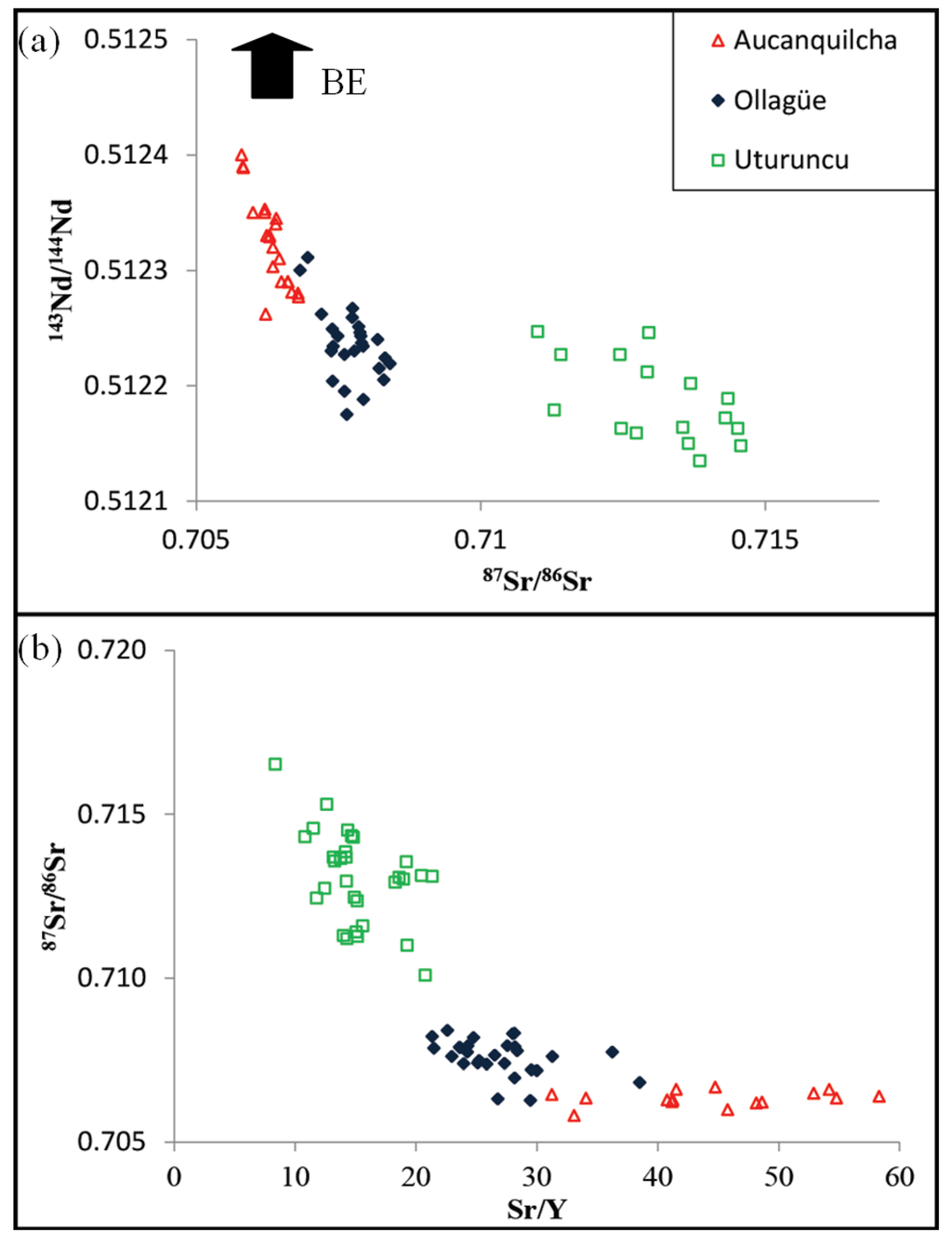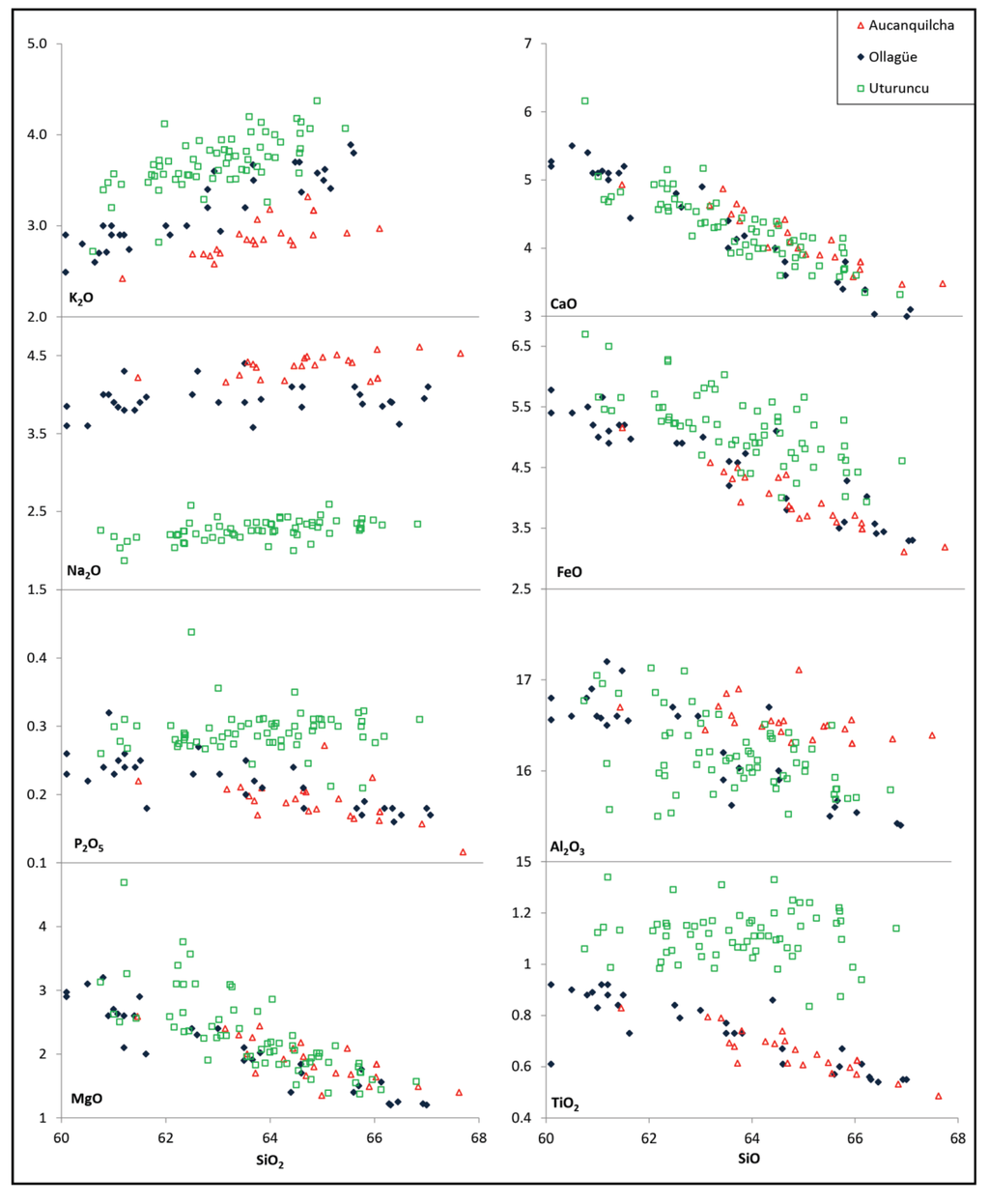 In this section we describe across-arc geochemical and isotopic variations of silicic volcanic rocks (i.e., >60 wt % SiO2) erupted from the three centers. We focus on silicic rocks because more mafic rocks are generally rare or non-existent at the three centers and the silicic rocks better record the compositions of crustal rocks through which the magmas ascended and interacted. Data for magmas erupted at Ollagüe and Aucanquilcha are in Feeley and Davidson [], Feeley and Hacker [], Feeley and Sharp [], Mattoli et al. [], Grunder et al. [], Klemetti and Grunder [], and Vezzoli et al. []. New whole rock and isotopic data are illustrated in this paper for Uturuncu rocks with representative analyses presented in Table 1, Table 2 and Table 3. A complete dataset for new analyses is available in the supplementary information. Additional major and trace element data for Uturuncu rocks are in Sparks et al. [].
